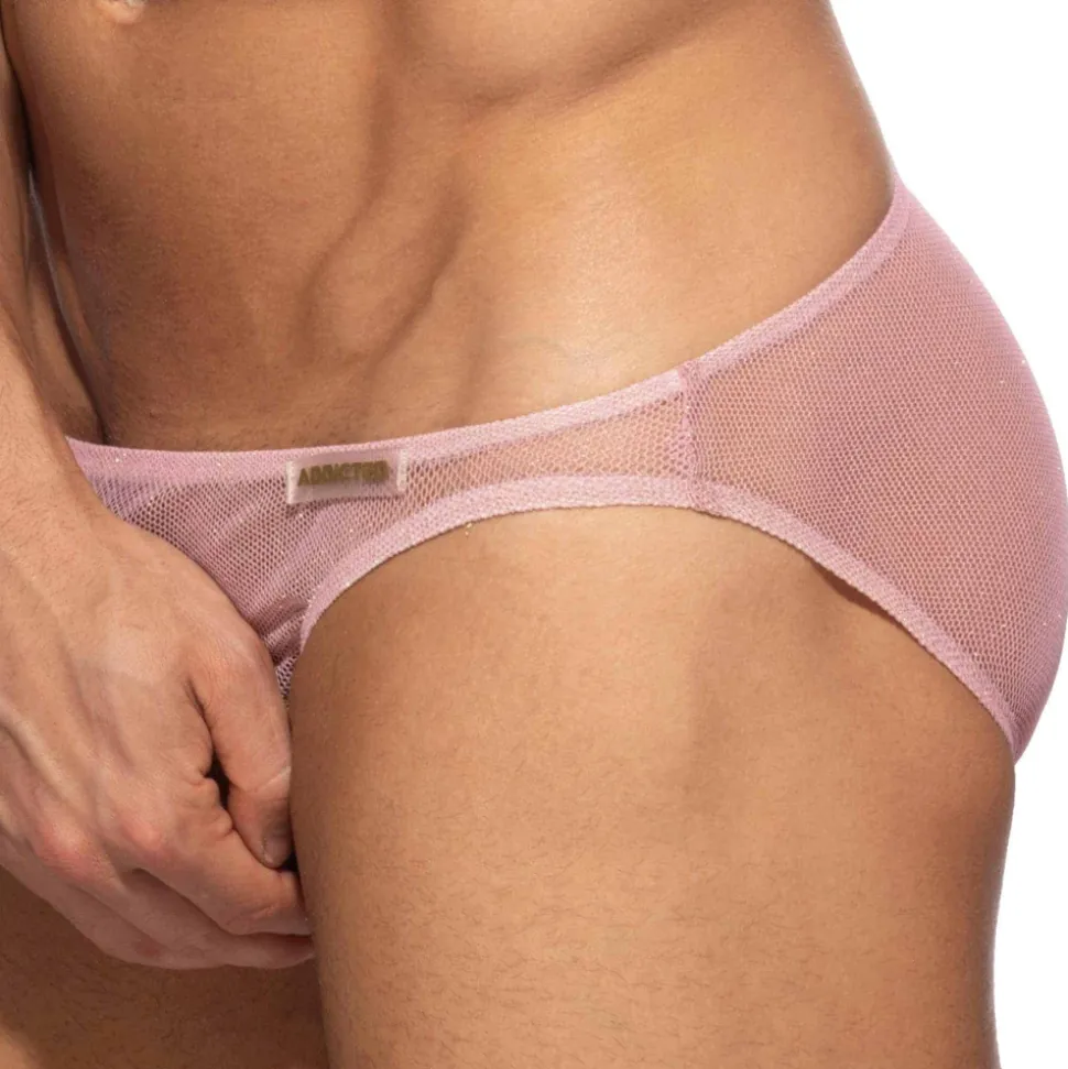 Slip sophistiqué et sexy en résille transparente ornée de fils métallisés dorés. Matière fine, légère et respirante. Coupe taille basse, minimaliste et très ajustée. Poche frontale moulée sans couture pour un confort optimal. Logo Addicted en silicone sur la fine ceinture élastique.