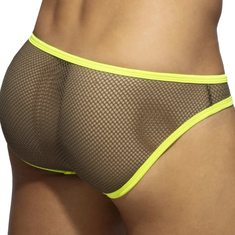 Slip sexy et provocant en résille extensible, dont le maillage large laisse peu de place à l’imagination. Coupe taille basse, minimaliste et très ajustée. Poche frontale moulée sans couture, pour un confort optimal. Bordures de couleur contrastée. Logo Addicted en silicone.