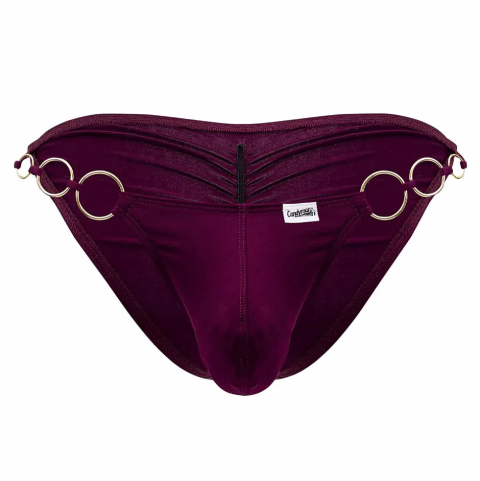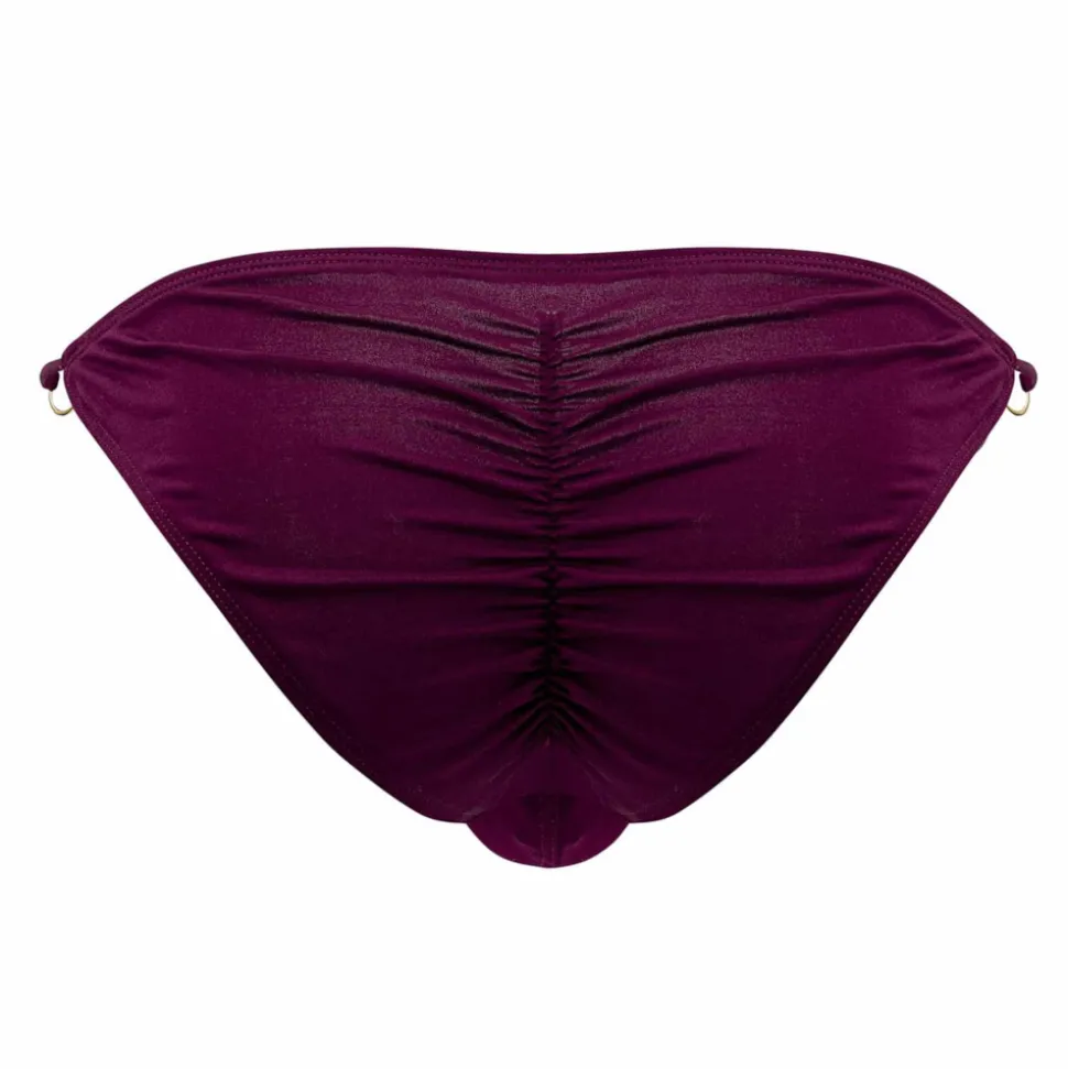 Slip tanga sexy en microfibre extensible, aussi douce et lisse qu’une seconde peau. Coupe taille basse, minimaliste, et très échancrée sur les fesses. Fines bretelles latérales reliées par des anneaux en métal doré. Poche frontale non doublée.