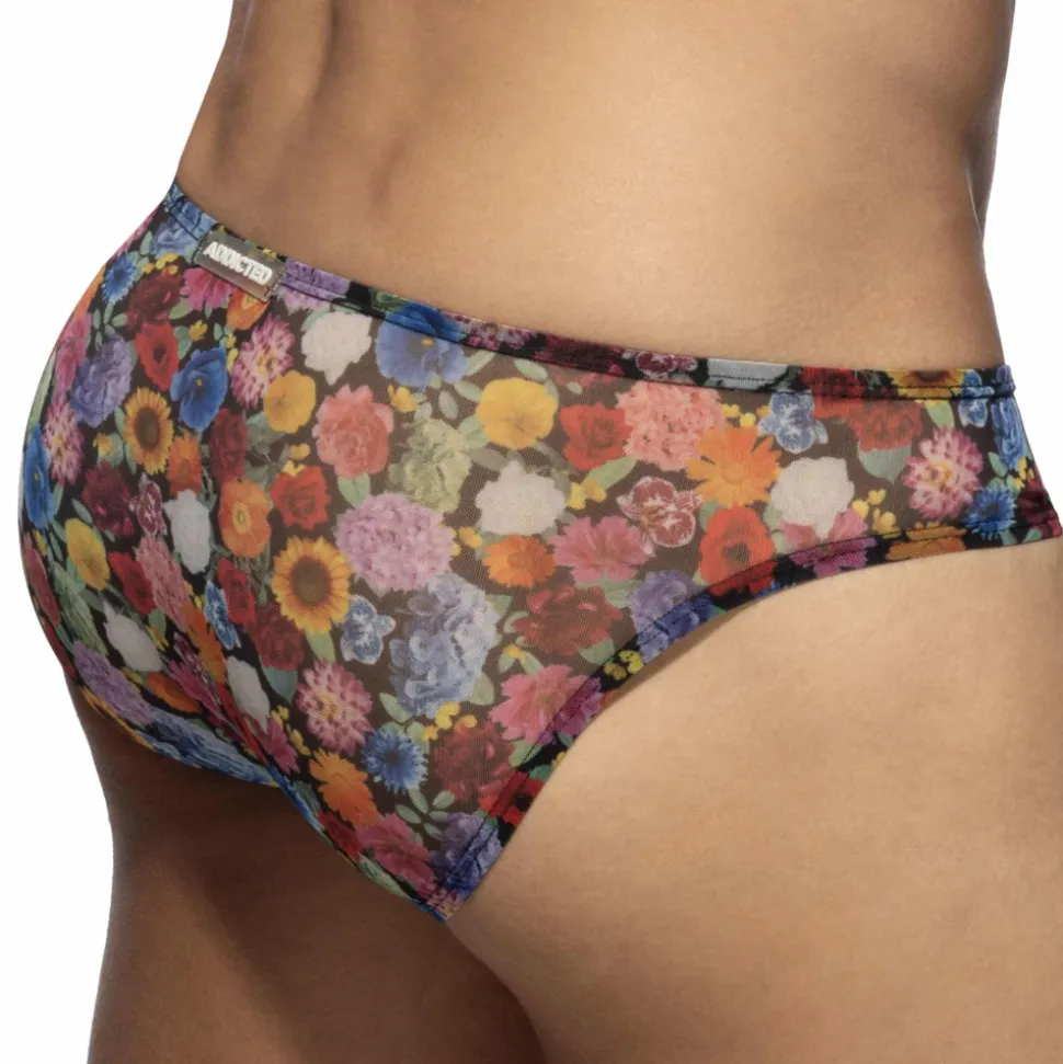 Slip luxueux en résille imprimée d’un motif floral très coloré. Tissu fin, super extensible et totalement transparent. Coupe taille basse, minimaliste et très ajustée. Belle poche frontale non doublée. Etiquette Addicted en silicone à l’arrière.