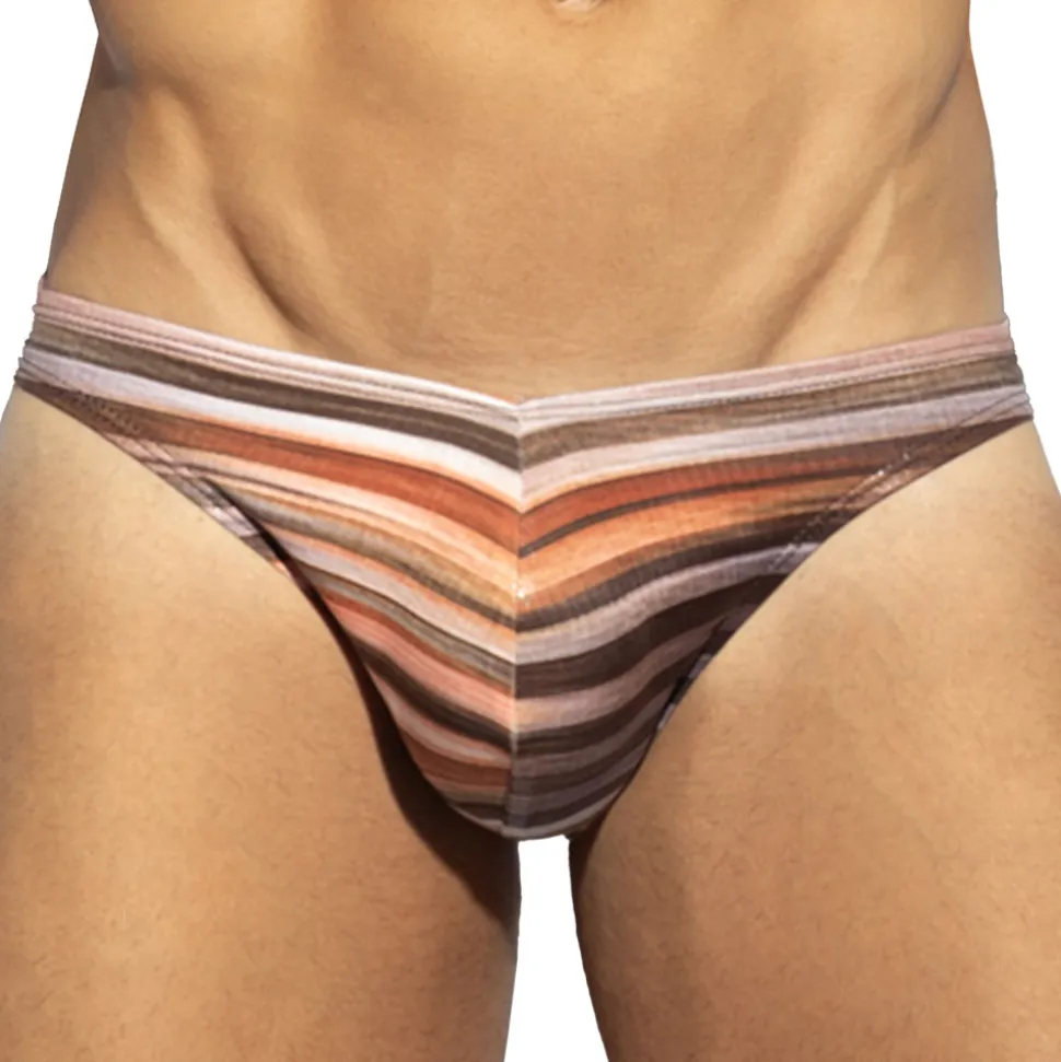 Slip en microfibre extensible, super douce et légère. Finition satinée avec effet liquide. Rayures horizontales. Coupe bikini taille basse, minimaliste et très ajustée. Grande poche frontale non doublée. Etiquette ES Collection en silicone à l’arrière.