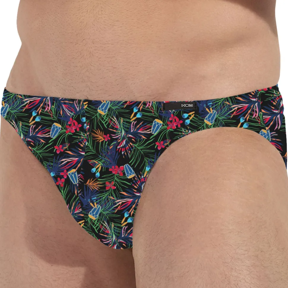 Slip mini taille basse en microfibre extensible ultra douce et confortable. Imprimé floral multicolore sur fond noir. Poche frontale doublée. Ceinture élastique fine avec étiquette HOM cousue sur la hanche gauche.
