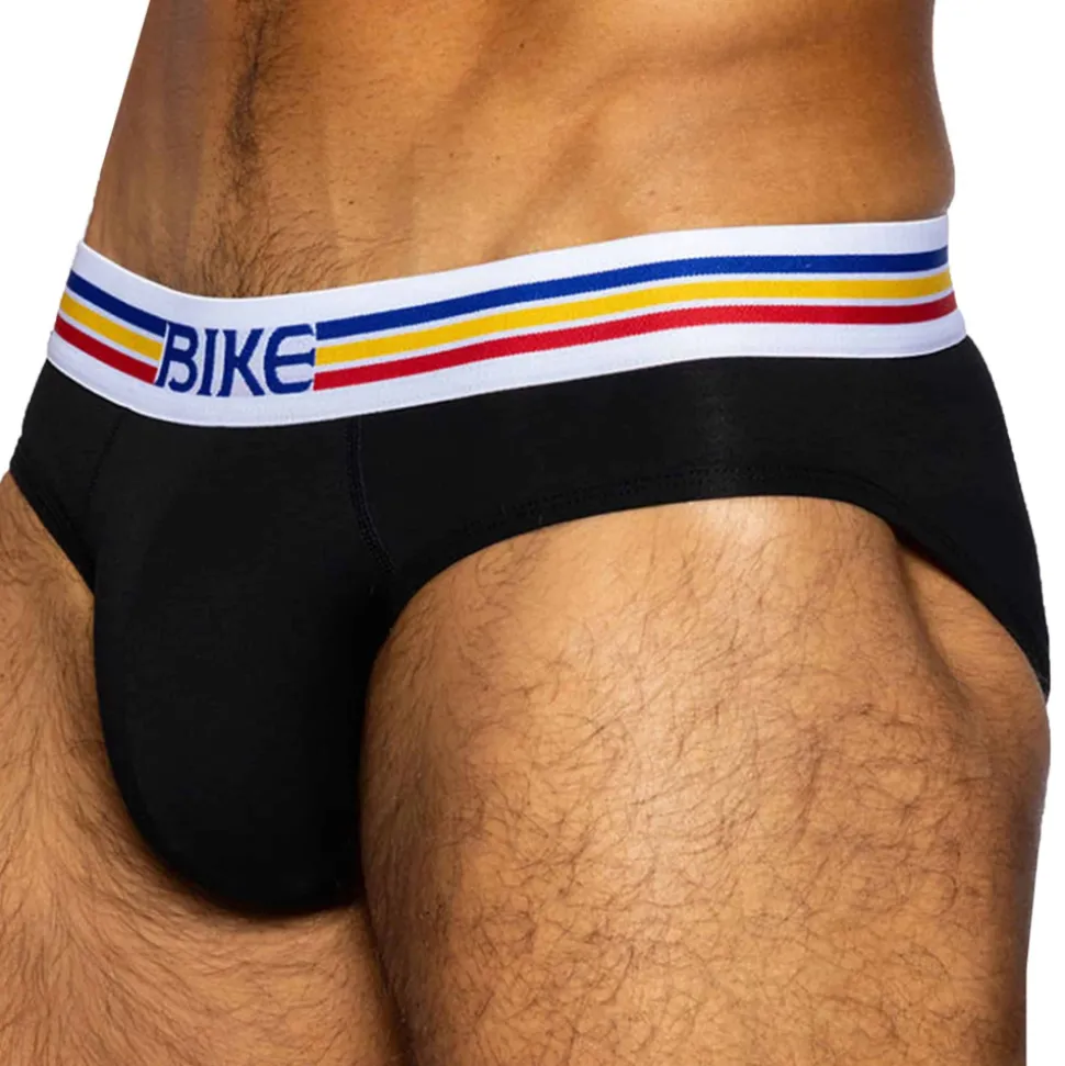 Slip en coton extensible, doux et confortable. Coupe taille basse et ajustée. Poche frontale doublée assurant un maintien ferme et confortable. Ceinture élastique signée BIKE.