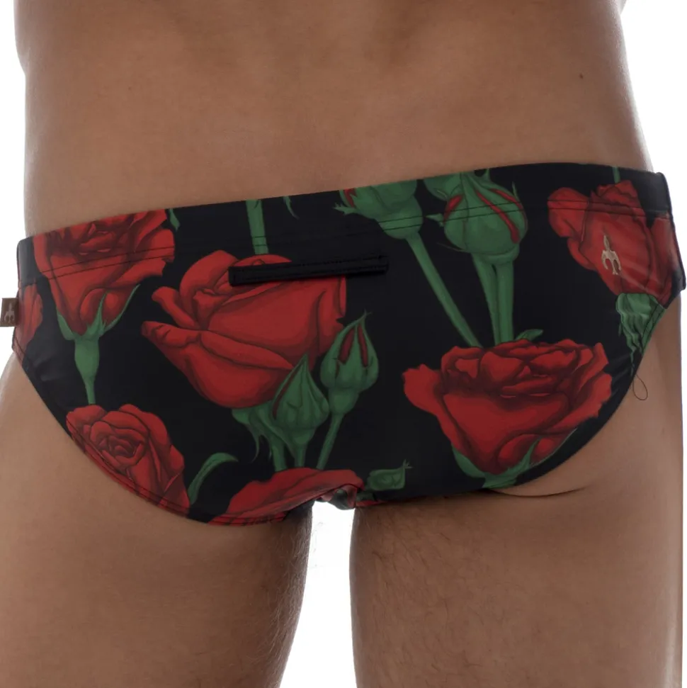 Slip de bain très sexy en microfibre italienne extensible et résistante. Imprimé floral constiué de roses rouges. Coupe super taille basse et très ajustée. Poche frontale doublée. Logo brodé sur la fesse droite. Ceinture élastique avec cordon de serrage.