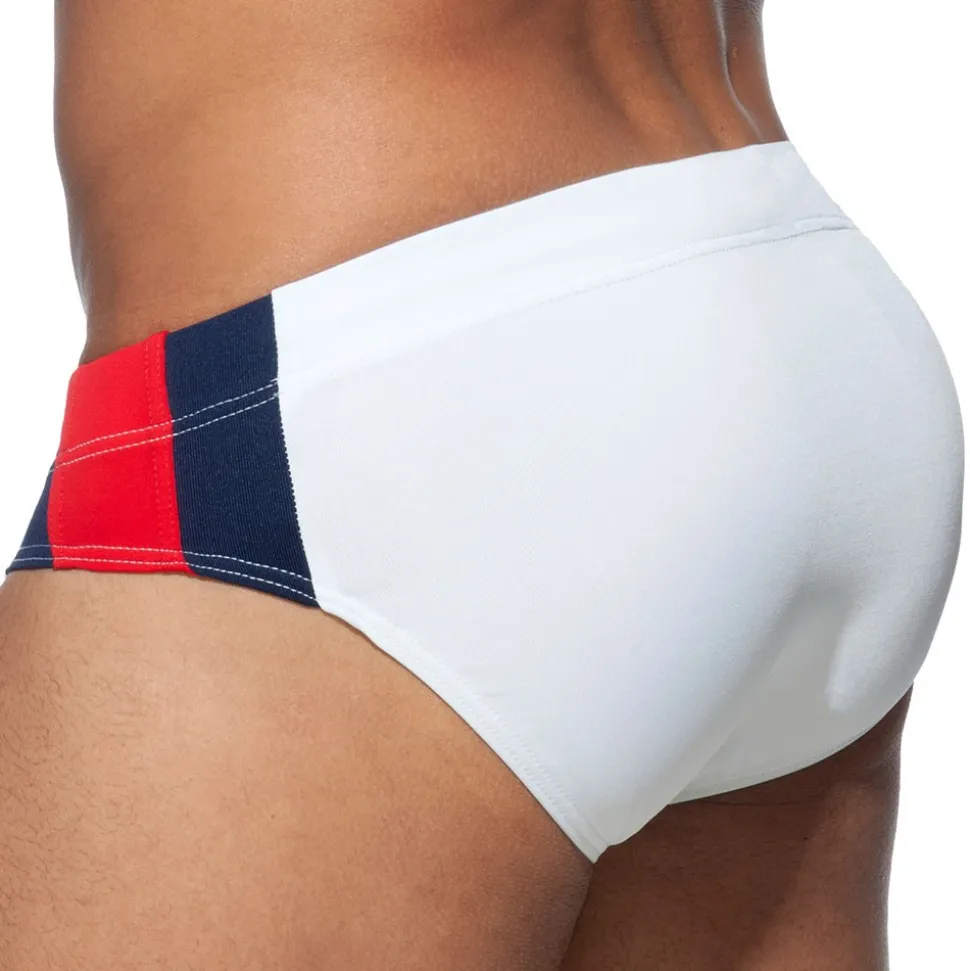 Slip de bain taille basse, sexy et ajusté. Système Pack Up intégré avec mousse amovible pour mettre en avant votre masculinité. Triple bande sport de couleur contrastée de chaque côté. Logo Addicted aux couleurs de l’arc-en-ciel sur la ceinture élastique. Cordon de serrage. Fabriqué à Barcelone.