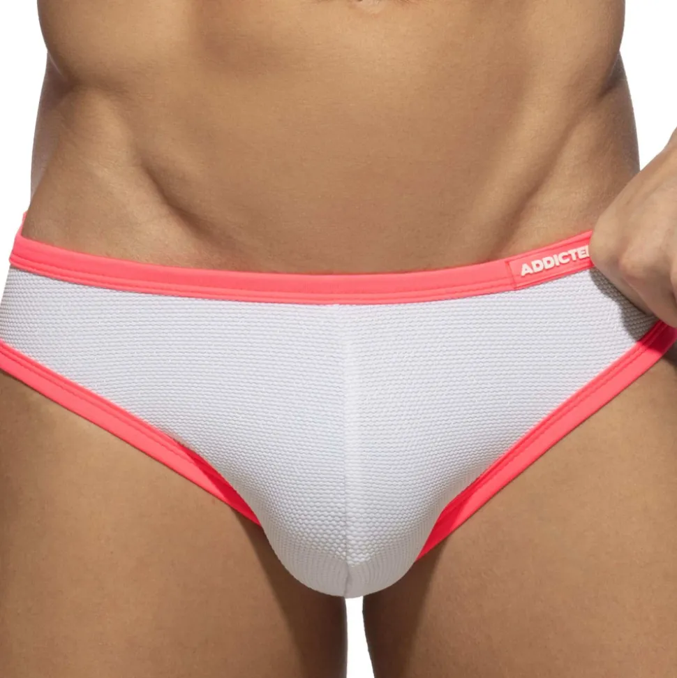 Slip de bain taille basse en microfibre piquée douce et légère. Style réservé aux plus audacieux : la poche frontale non doublée révèlera tout une fois mouillée ! Fils métallisés pour un effet pailleté. Bordures de couleur fluo. Logo Addicted en silicone sur la fine ceinture élastique.