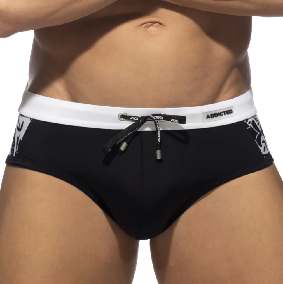 Slip de bain premium en microfibre super extensible et confortable. Motif abstrait sophistiqué sur les côtés pour un look élégant et moderne. Ceinture contrastée avec cordon de serrage. Logo Addicted en silicone sur la ceinture élastique.