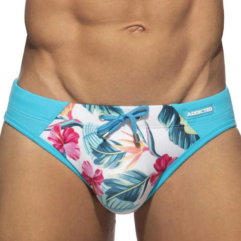 Slip de bain sexy en microfibre extensible, légère et respirante. Imprimé floral élégant. Coupe taille basse et ajustée. Ceinture élastique avec cordon de serrage. Système Pack Up intégré avec mousse amovible pour mettre en valeur votre masculinité. Poche frontale moulée sans couture pour un confort optimal. Etiquette logo Addicted en silicone sur la hanche gauche.