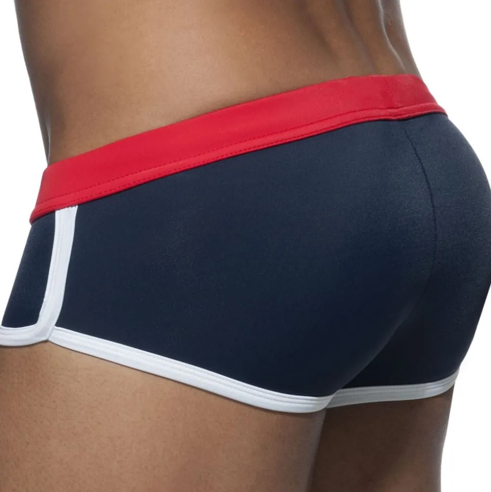 Slip de bain taille basse en microfibre douce et agréable à porter. Système Pack Up intégré. Bordures de couleur contrastée. Logo Addicted en silicone. Ceinture élastique avec cordon de serrage. Fabriqué à Barcelone.
