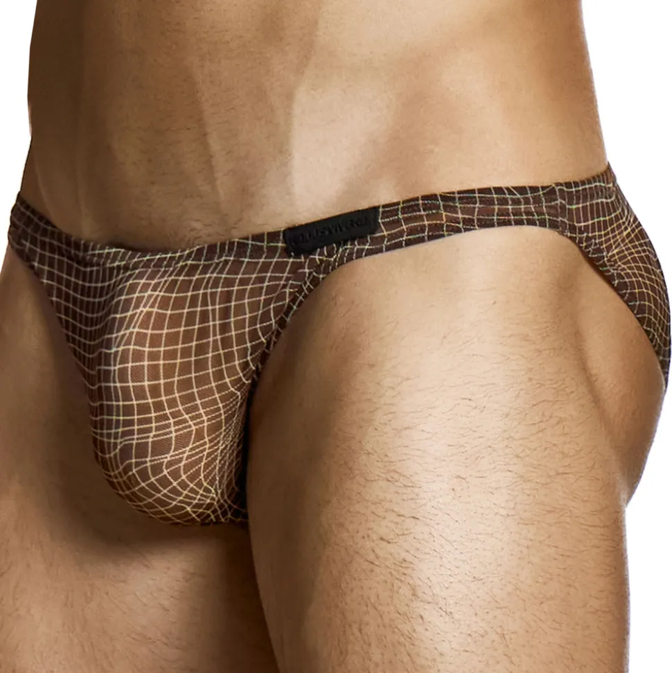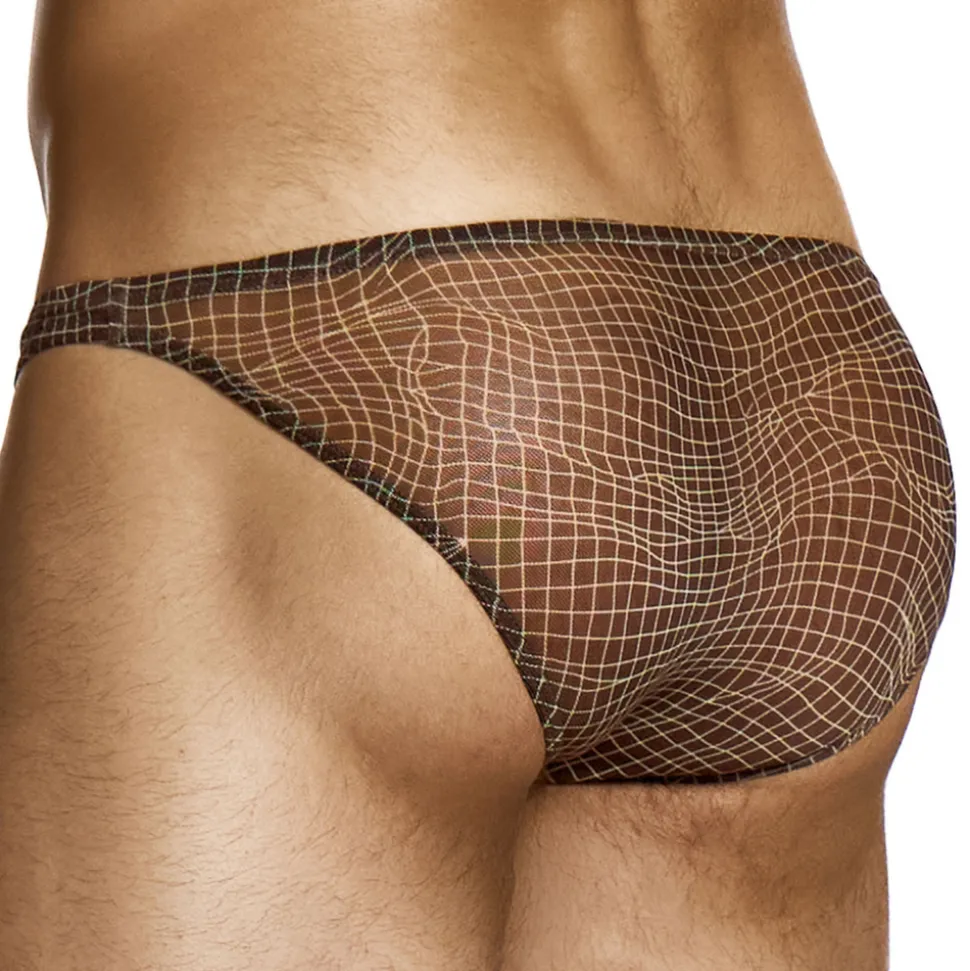 Slip sensuel en fine résille légèrement transparente et très douce, pour en effet seconde peau. Motif géométrique abstrait qui révèle subtilement le corps tout en mettant en valeur vos formes, pour un impact visuel maximal. Coupe taille basse minimaliste. Poche frontale non doublée. Etiquette Modus Vivendi en silicone cousue sur la hanche gauche.