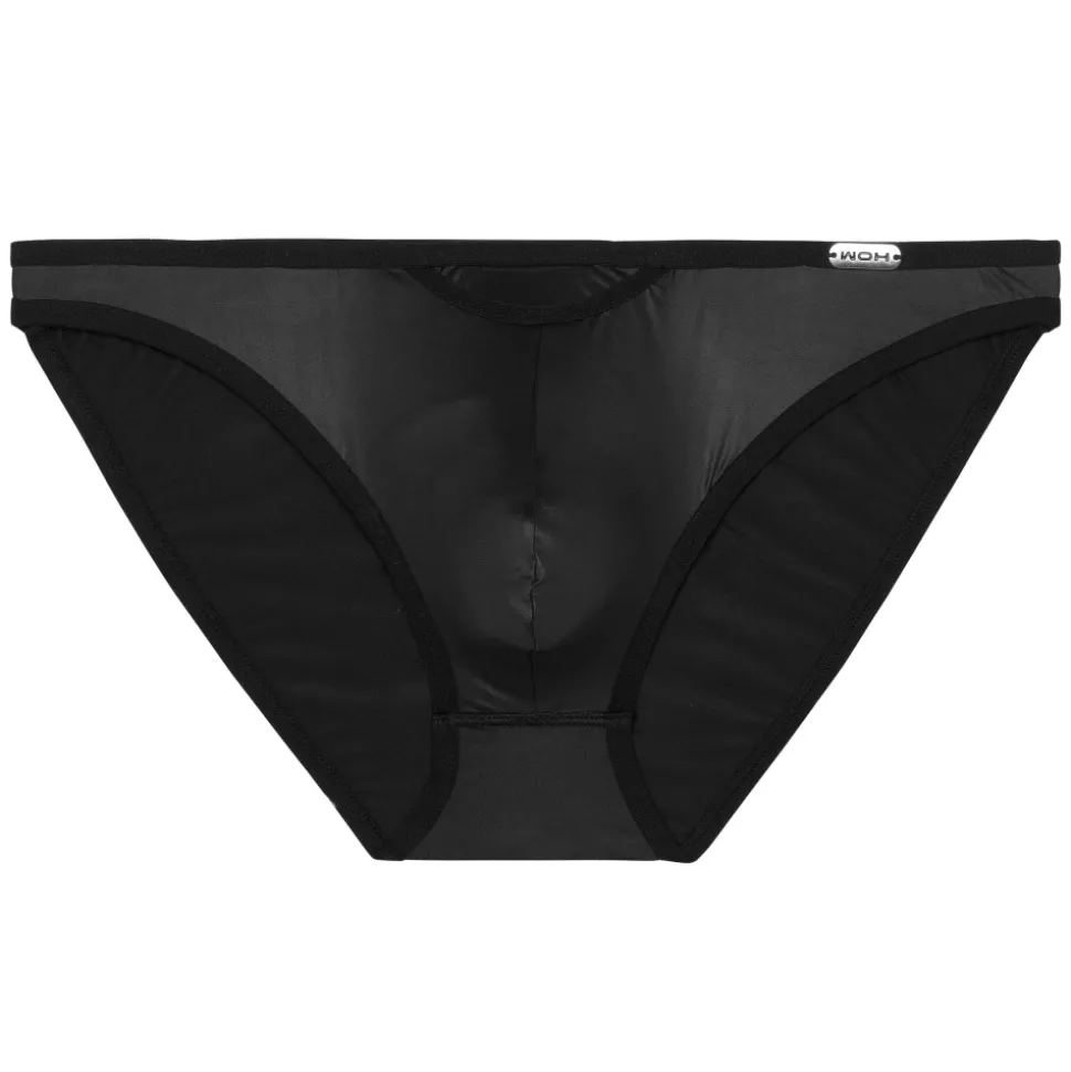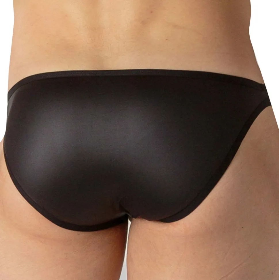 Slip mini, sexy et provocant, en microfibre extensible imitant le cuir, pour un look fétichiste. Ouverture horizontale , aussi pratique pour les droitiers que les gauchers. Fine ceinture élastique avec plaque métallique WOH.