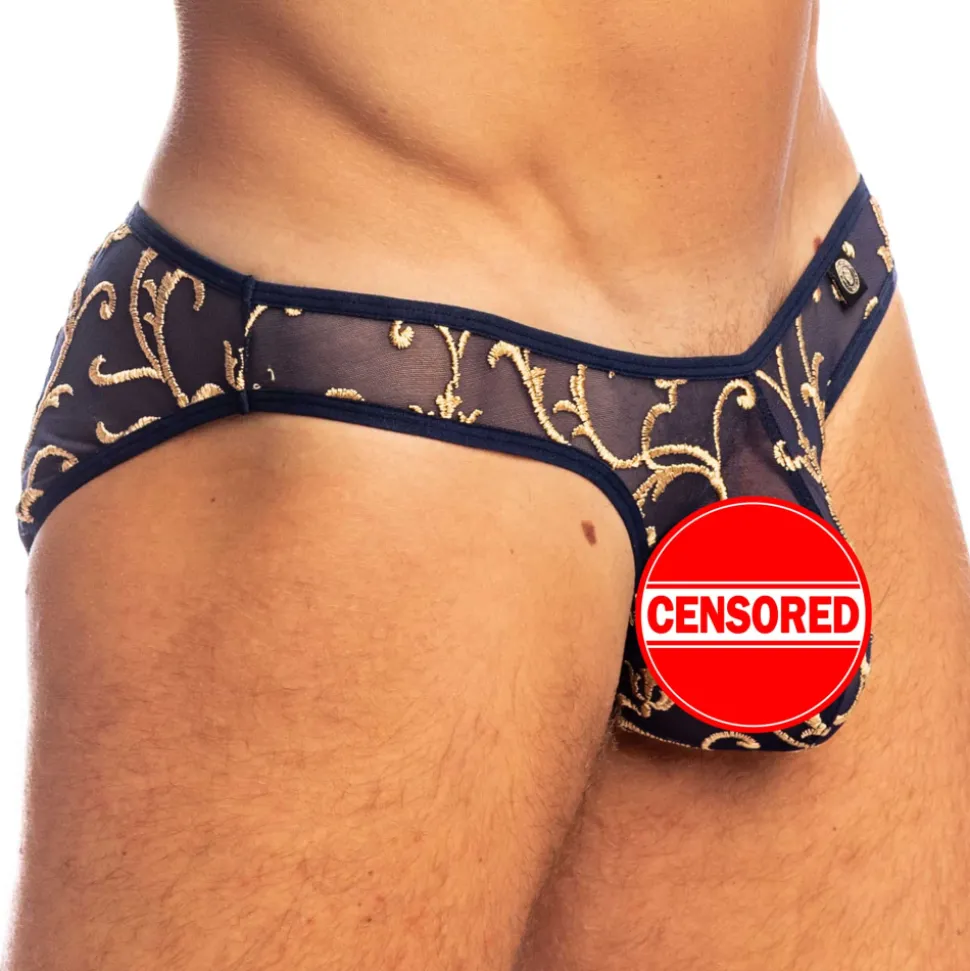 Slip luxueux et raffiné en tulle léger et transparent. Tissu brodé d’arabesques dorées rappelant les fastes de Versailles. Coupe minimaliste super taille basse. Poche frontale préformée, non doublée. Fine ceinture élastique.