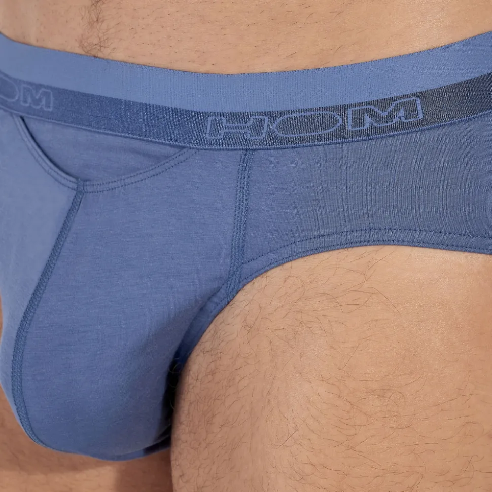 Slip en mélange doux et soyeux de coton et de modal. Coupe classique assurant confort et maintien. Ouverture horizontale HO1 brevetée par HOM, aussi pratique pour les droitiers que les gauchers. Ceinture élastique signée HOM.