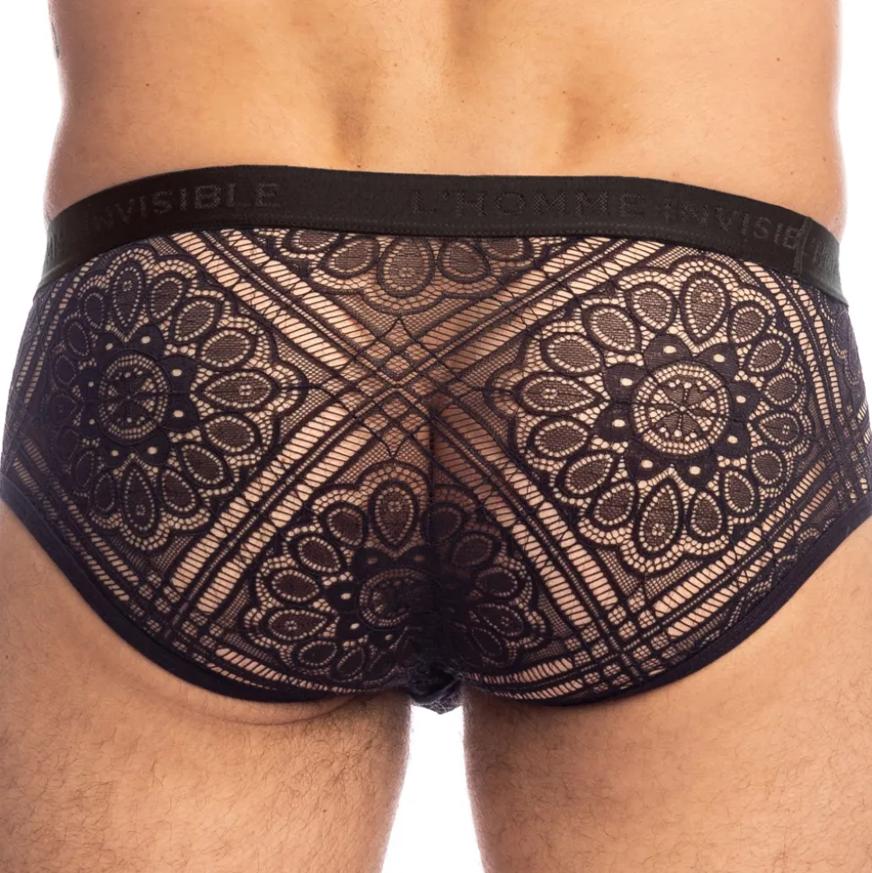 Slip élégant et sophistiqué en dentelle douce, légère et confortable. Tissu transparent orné d’un superbe motif. Coupe taille basse ajustée. Poche frontale ergonomique push up non doublée, pour une totale transparence. Ceinture élastique signée L’homme Invisible.