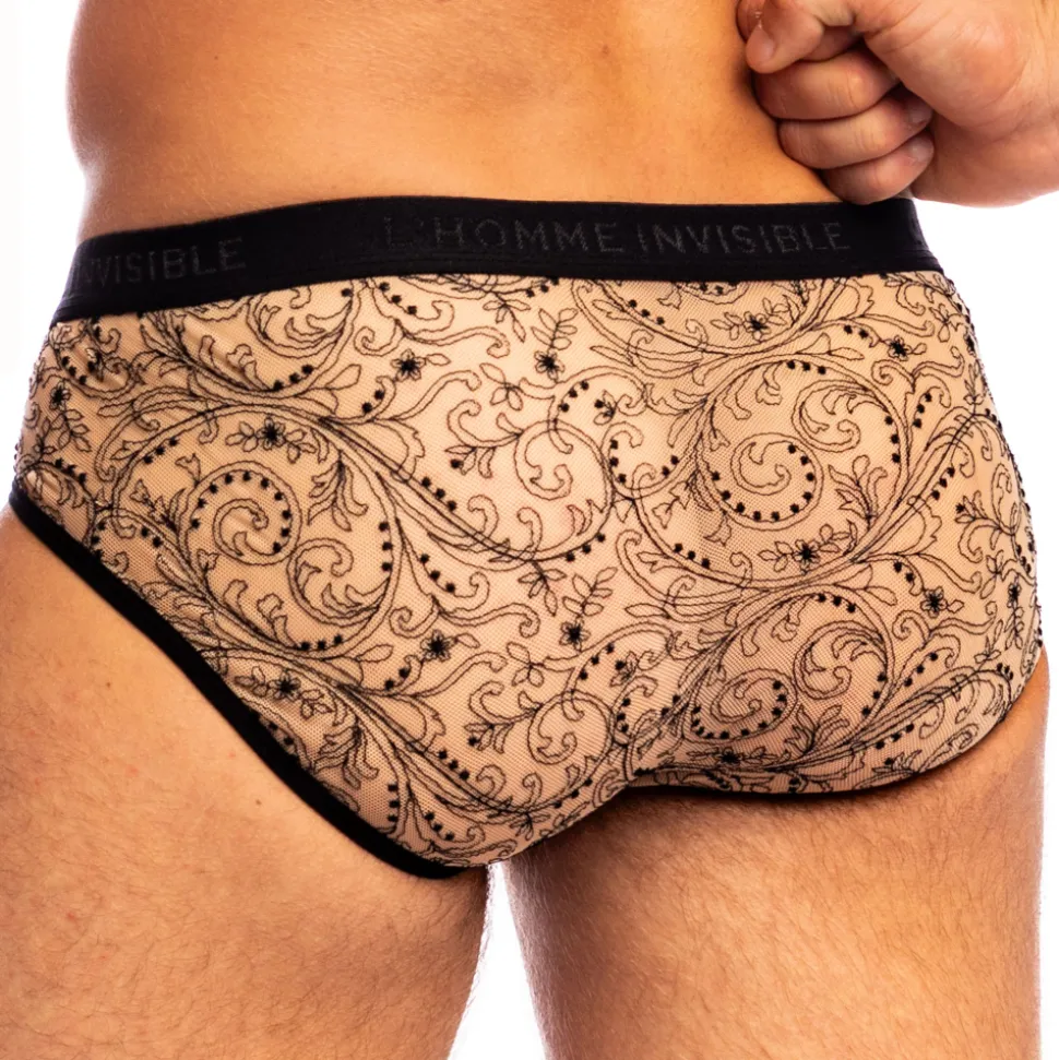 Slip luxueux et raffiné en fine résille couleur chair, délicate et semi-transparente. Tissu brodé d’un motif baroque sophistiqué qui dessine comme un tatouage à même la peau. Coupe taille basse ajustée. Poche frontale ergonomique push up non doublée. Ceinture élastique signée L’Homme Invisible.