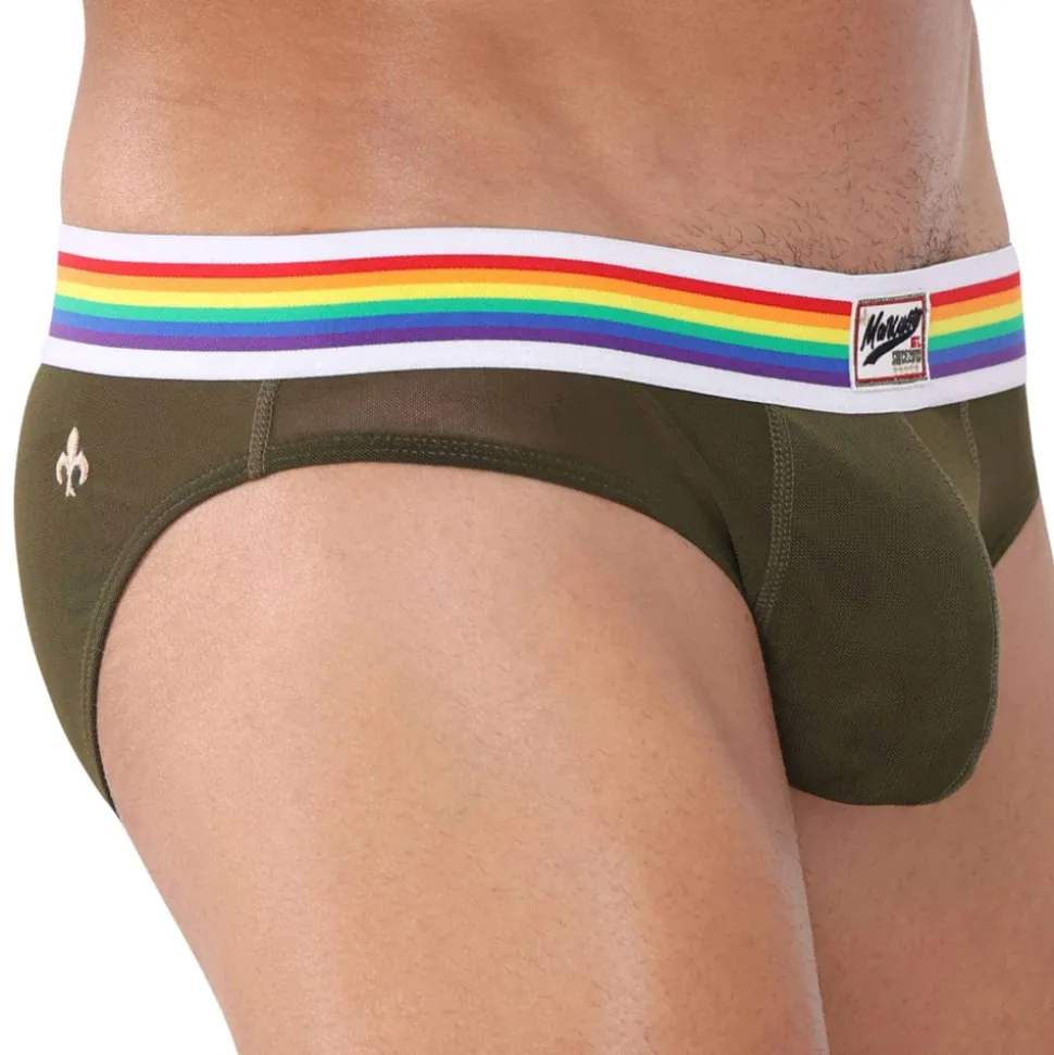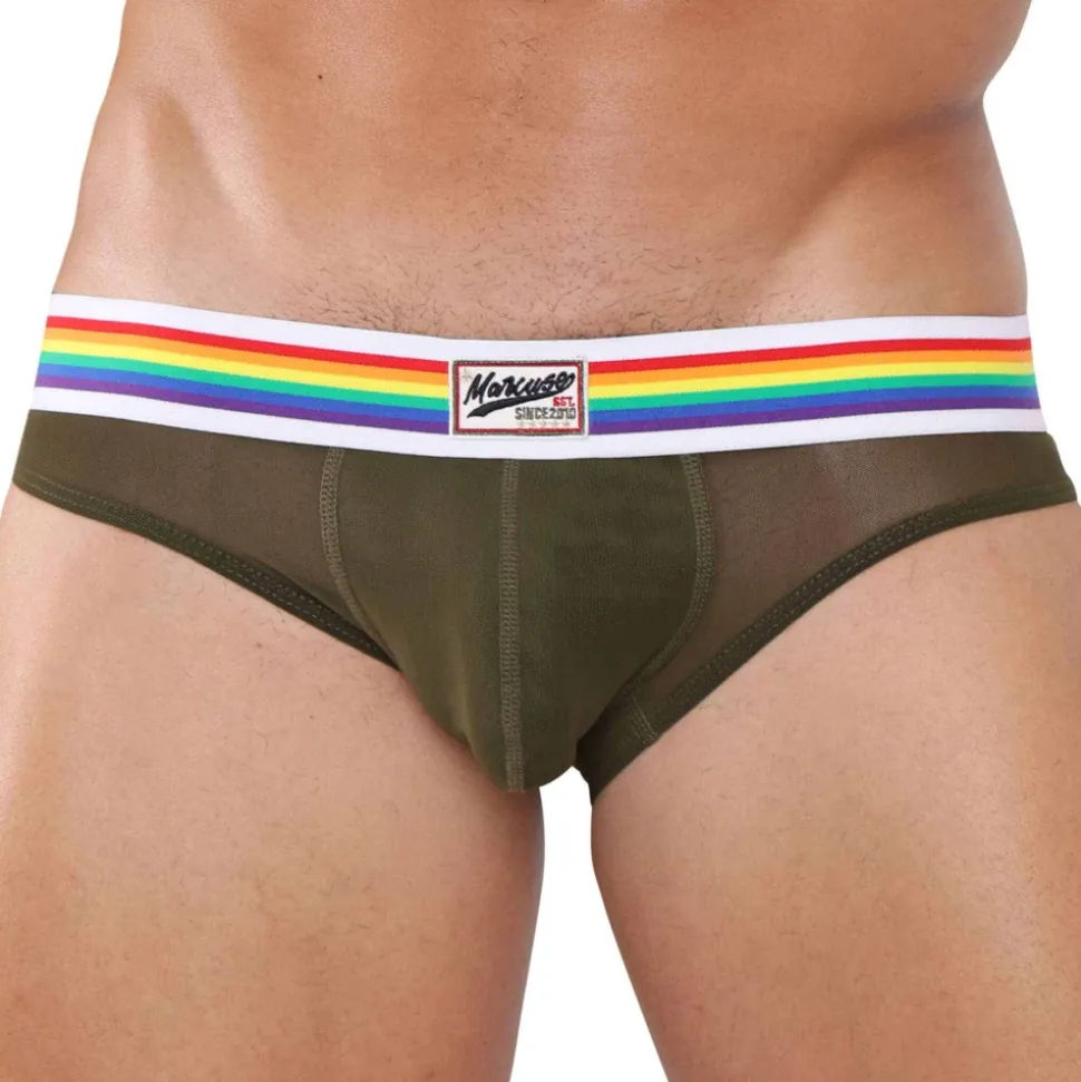 Slip très sexy en résille extensible semi-transparente, légère et respirante. Coupe taille basse ajustée. Ceinture élastique rayée aux couleurs de l’arc-en-ciel. Poche frontale préformée doublée pour plus de maintien. Logo Marcuse brodé sur la fesse droite.