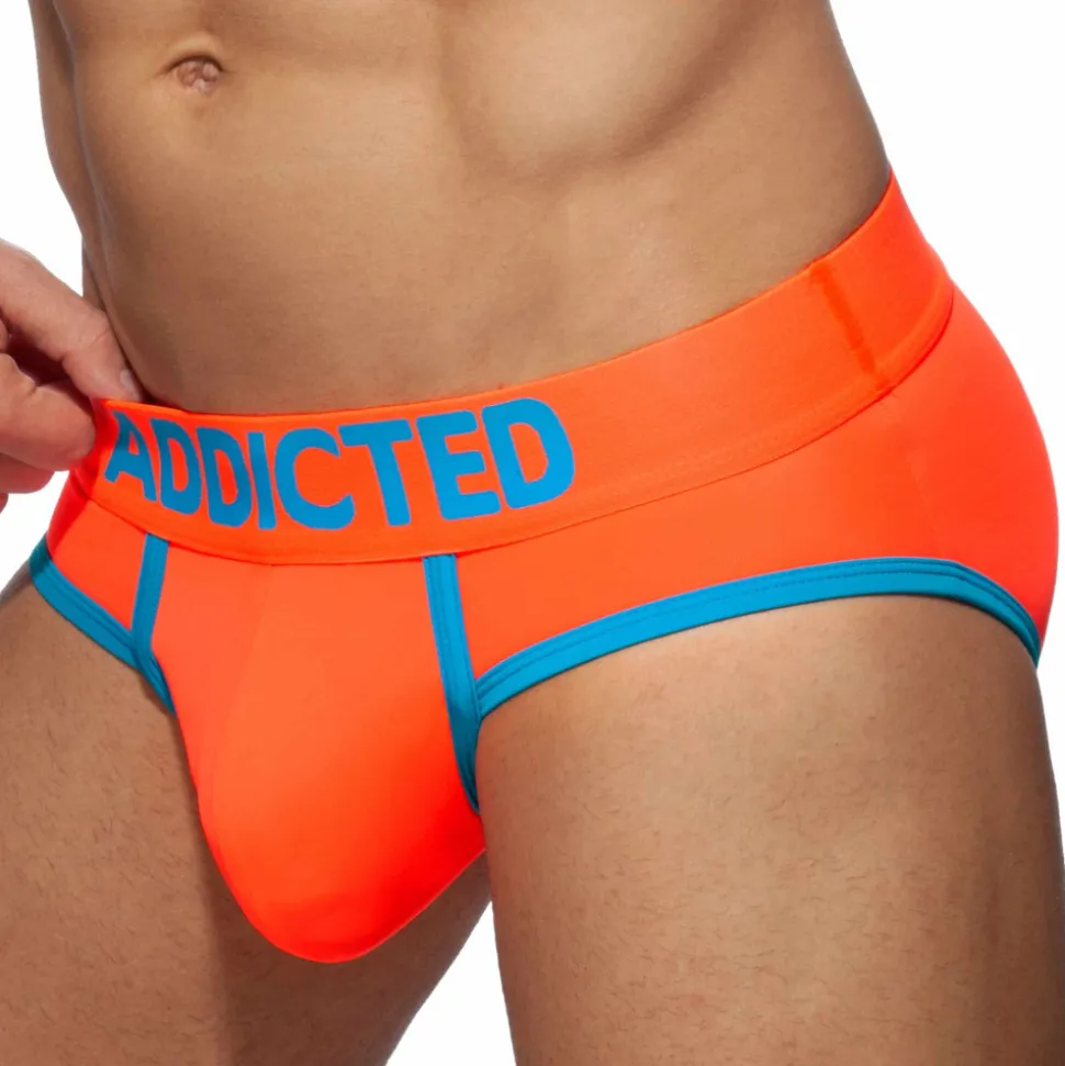 Slip 2 en 1 qui peut être porté en tant que sous-vêtement ou maillot de bain. Microfibre fluo à séchage rapide, ultra douce et résistante de couleur fluo. Matière et design innovants qui assurent un confort maximal sous un pantalon comme dans l’eau. Technologie RingUp intégrant un anneau cock ring en silicone (diamètre 5 cm, amovible par bouton pression) pour une érection plus dure et plus longue. Poche frontale push up pour mettre en avant votre masculinité, tout en assurant un maintien très confortable. Coupe taille basse très ajustée. Bordures de couleur contrastée. Ceinture élastique signée Addicted.