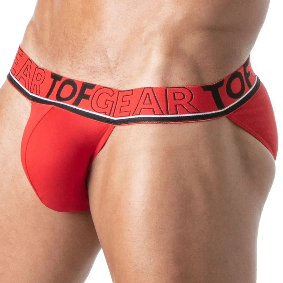 Slip taille basse en coton extensible. Coupe tanga très ajustée. Grande poche frontale non doublée. Bordures de couleur contrastée. Ceinture élastique jacquard signée TOF GEAR. Fabrication française.