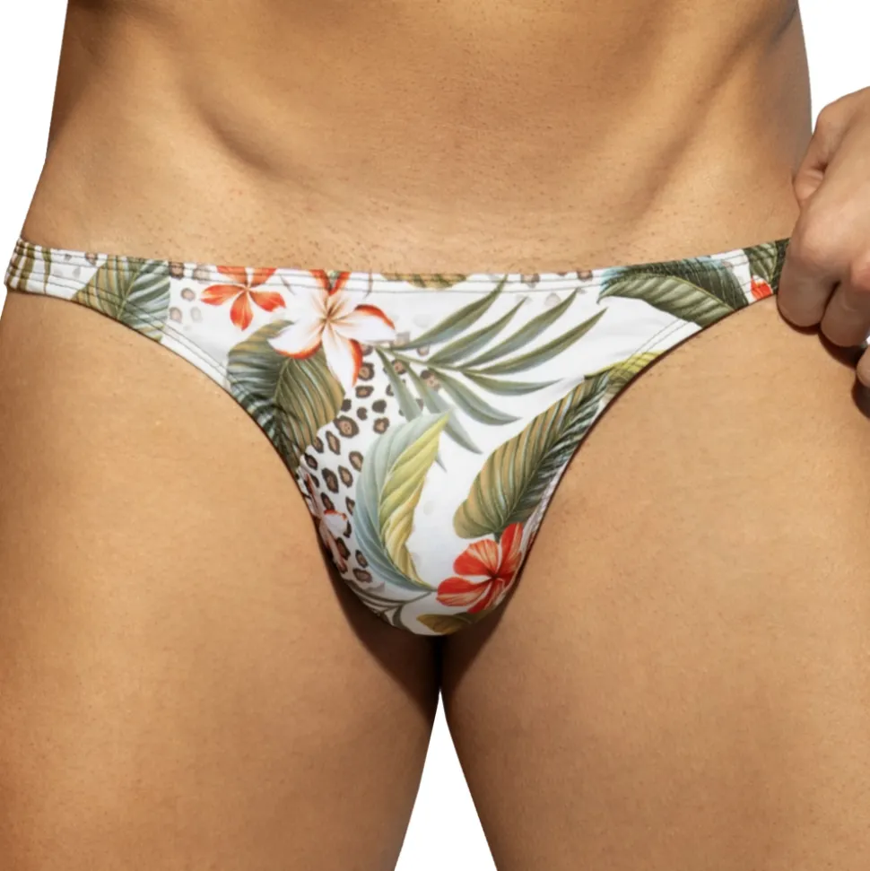 String de bain taille basse en microfibre extensible ultra douce. Imprimé tropical délicat twisté par des touches de léopard, pour une allure à la fois exotique et audacieuse. Système Pack Up intégré avec mousse amovible pour mettre en avant votre masculinité. Poche frontale moulée sans couture pour un confort optimal. Etiquette ES Collection en silicone au dos.