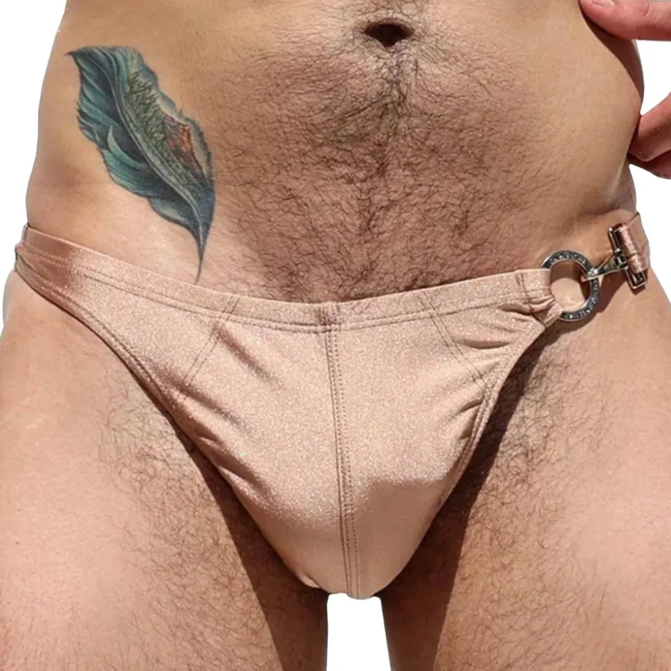 String de bain taille basse en microfibre extensible, douce et confortable. Coupe minimaliste très ajustée avec boucle et mousqueton métalliques sur le côté gauche. Finition satinée qui capte la lumière, offrant un look sensuel et sophistiqué. Poche frontale enveloppante doublée.