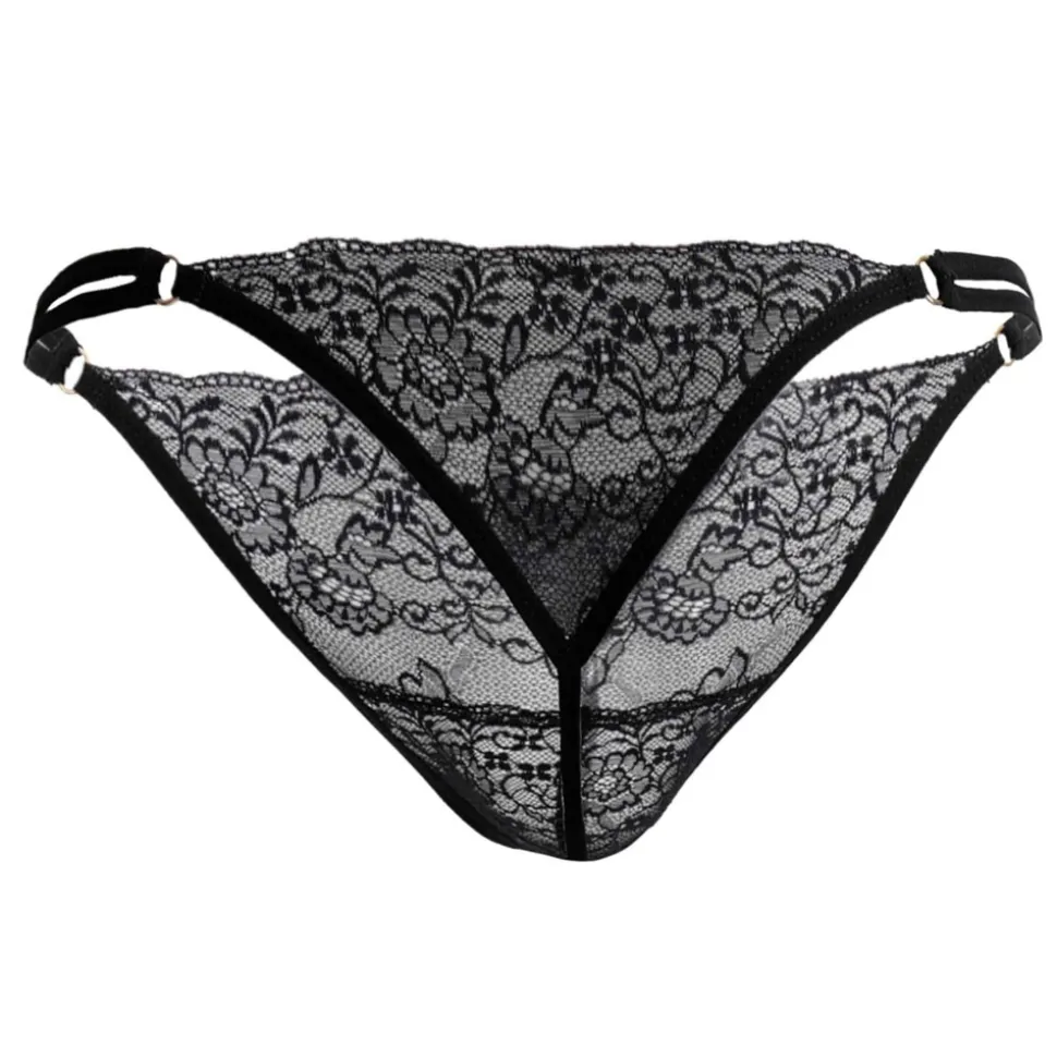 String taille basse, sexy et provocant, en dentelle transparente. Fines bandes élastiques attachées par de petits anneaux dorés sur les côtés.