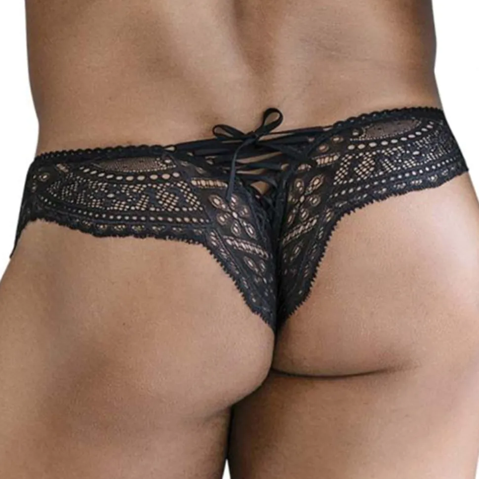 String sexy et audacieux en dentelle noire délicate. Poche frontale non doublée en résille transparente. Laçage style corset en haut des fesses.