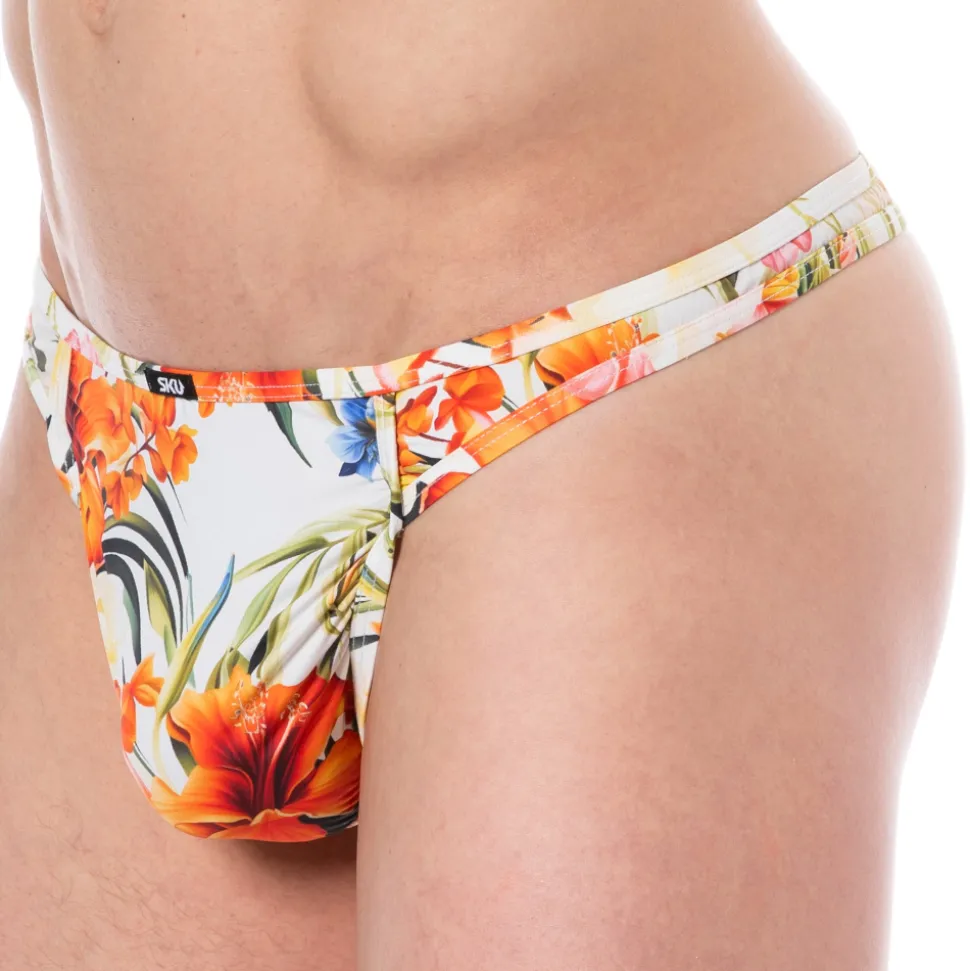 String taille basse en microfibre extensible ultra douce et légère, pour un effet seconde peau. Superbe imprimé tropical original et intense. Poche frontale ergonomique assurant un maintien exceptionnel. Etiquette SKU cousue sur la fine ceinture élastique.