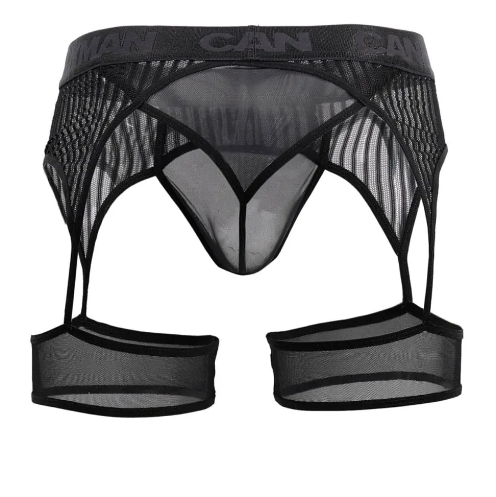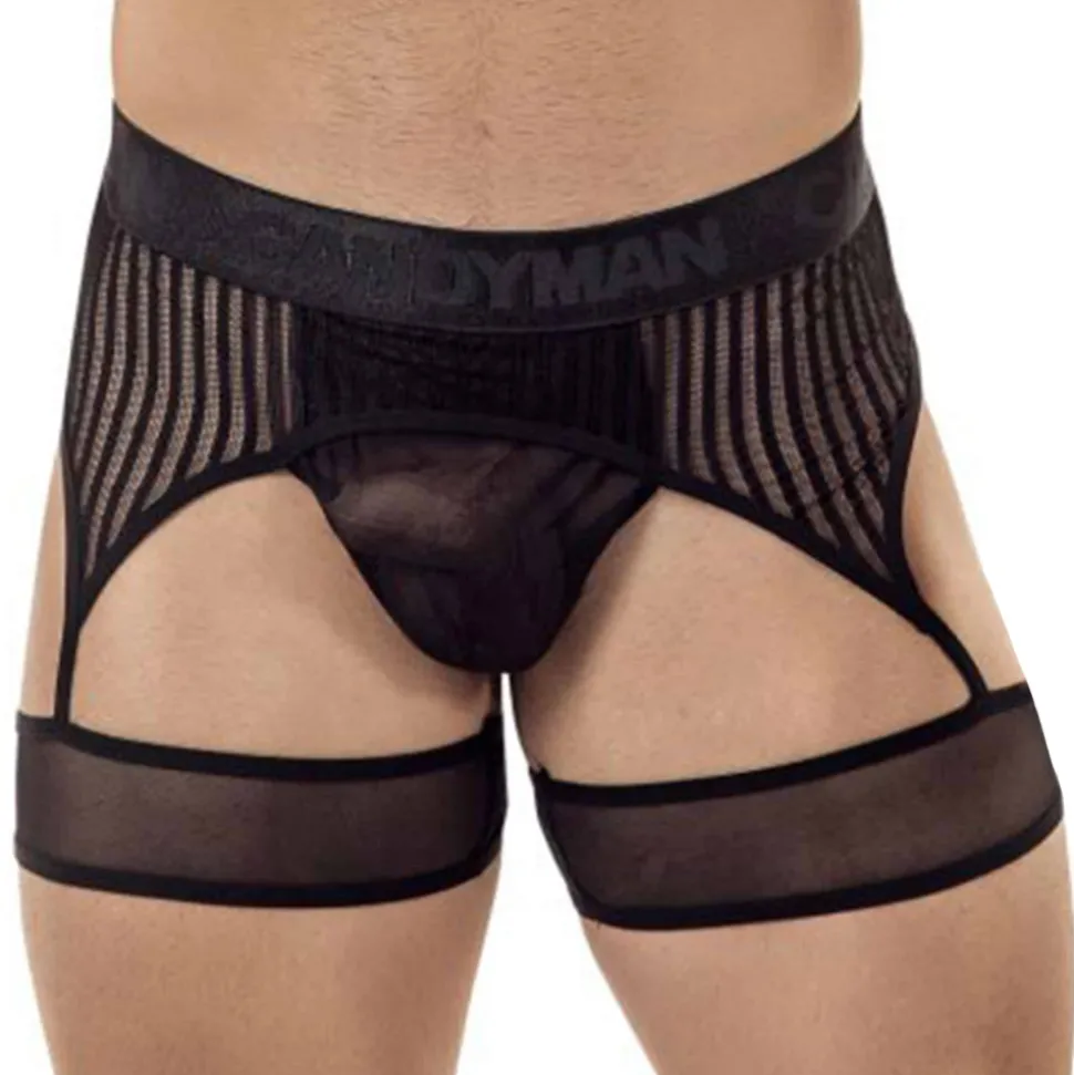 String très sexy en voile transparent combiné à un porte-jarretelle en résille rayée. Jarretières en tulle. Ceinture élastique signée Candyman ton-sur-ton.