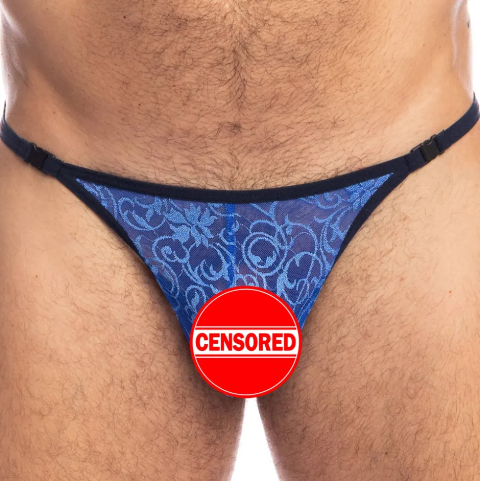 String sensuel et raffiné en dentelle douce, légère et confortable. Tissu transparent orné d’un motif baroque bleu. Coupe minimaliste avec clips fonctionnels. Poche frontale non doublée. Design en Y à l’arrière pour mettre en valeur votre fessier. Bordures de couleur contrastée.