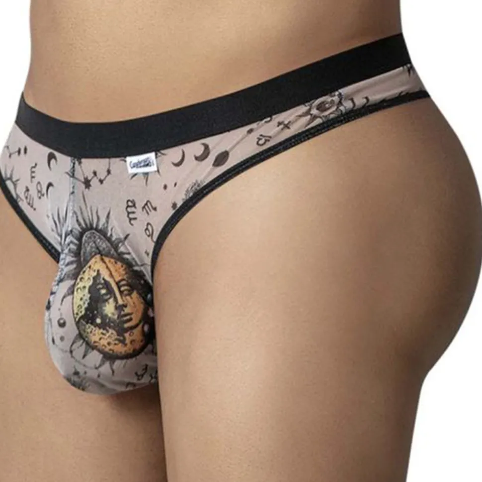 String très sexy en résille transparente imprimée d’un motif mystique constitué de soleils, lunes et signes astrologiques. Coupe minimaliste, taille basse et ajustée. Poche frontale préformée, non doublée. Ceinture élastique.