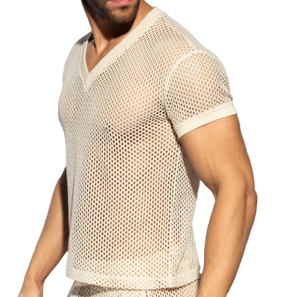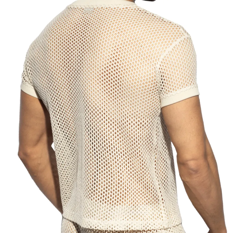 T-shirt en crochet épais et transparent. Tissu tricoté, confortable et luxueux, en pur coton. Manches courtes et col en V profond. Logo ES Collection en silicone au dos.