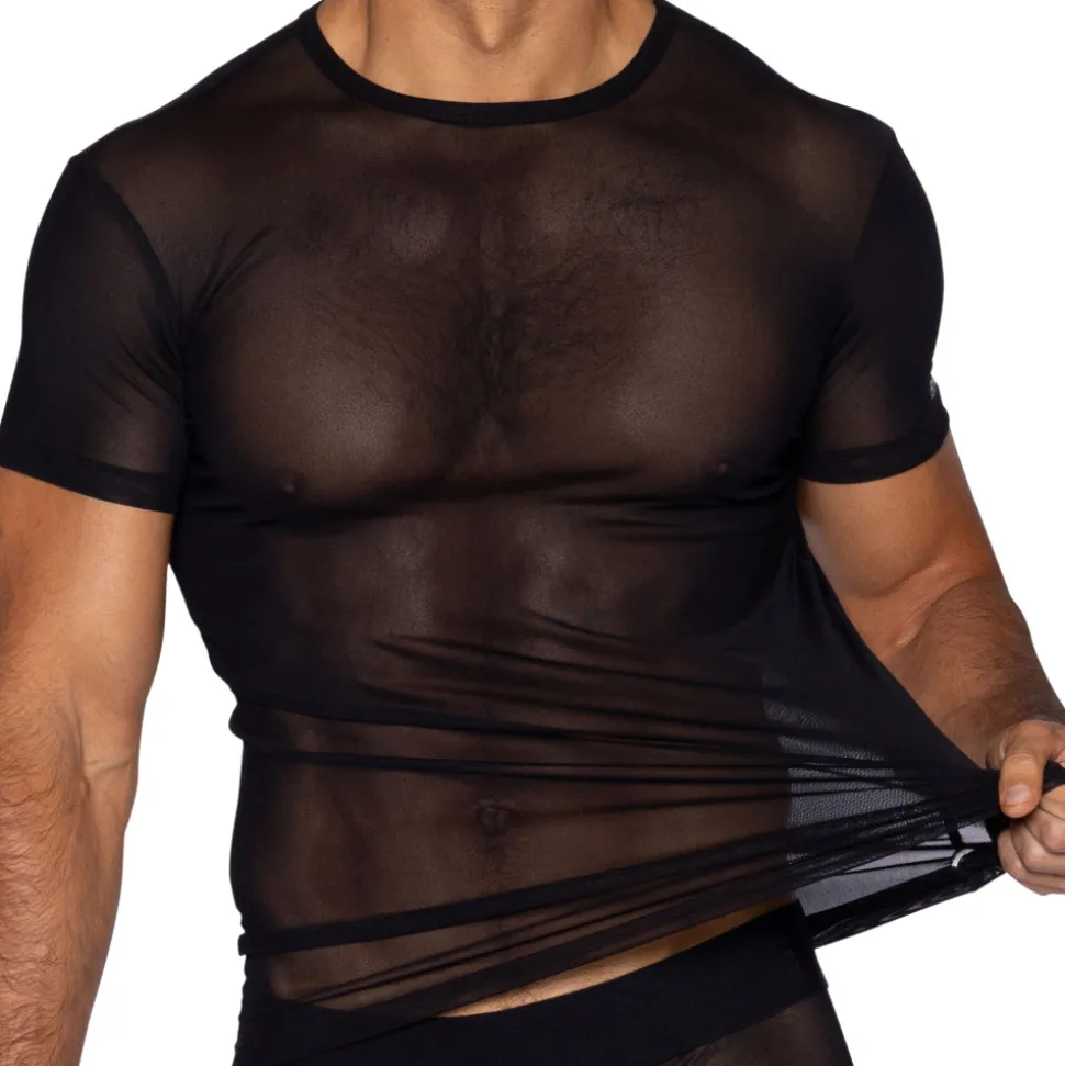 T-shirt sexy en fine résille transparente, légère et respirante. Coupe ajustée. Col rond.