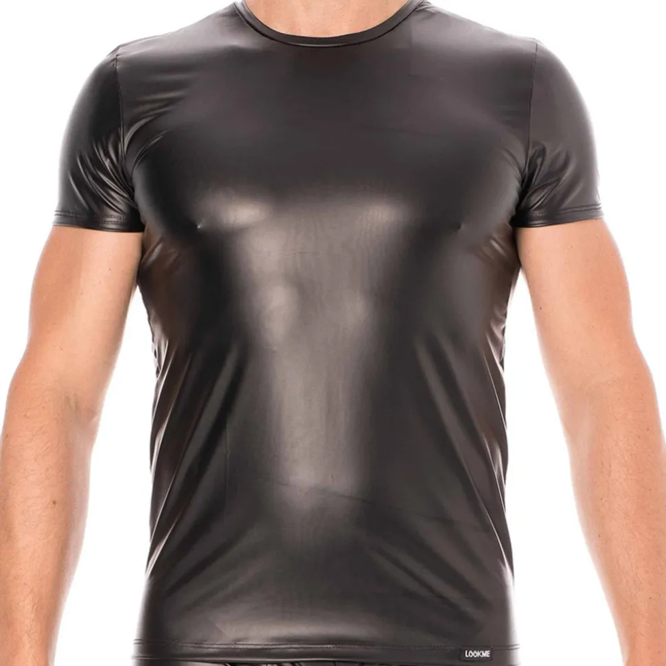 T-Shirt sexy et provocant en simili cuir extensible, souple et confortable. Col rond et manches courtes. Coupe ajustée pour souligner vos formes.