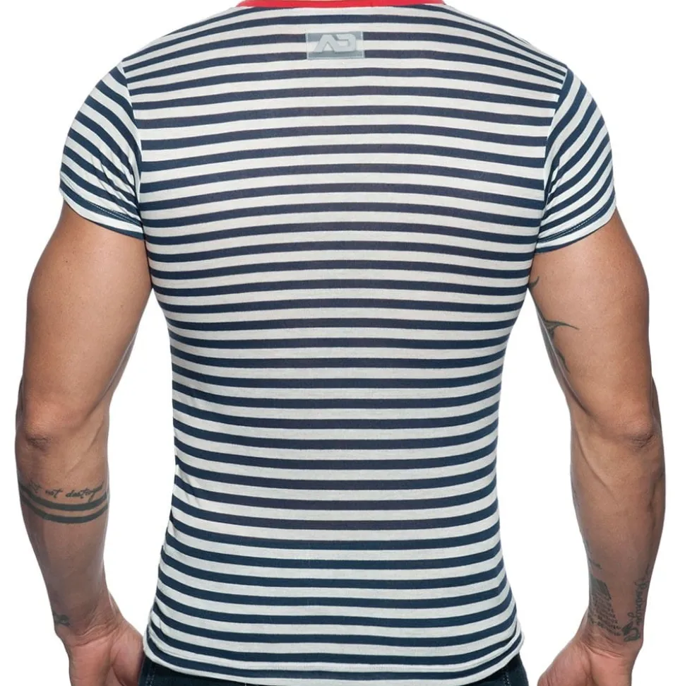 T-Shirt très ajusté en mélange doux, frais et soyeux à base de viscose. Imprimé marinère très tendance. Bordures de couleur contrastée. Logo Addicted en silicone dans le dos. Fabriqué à Barcelone.