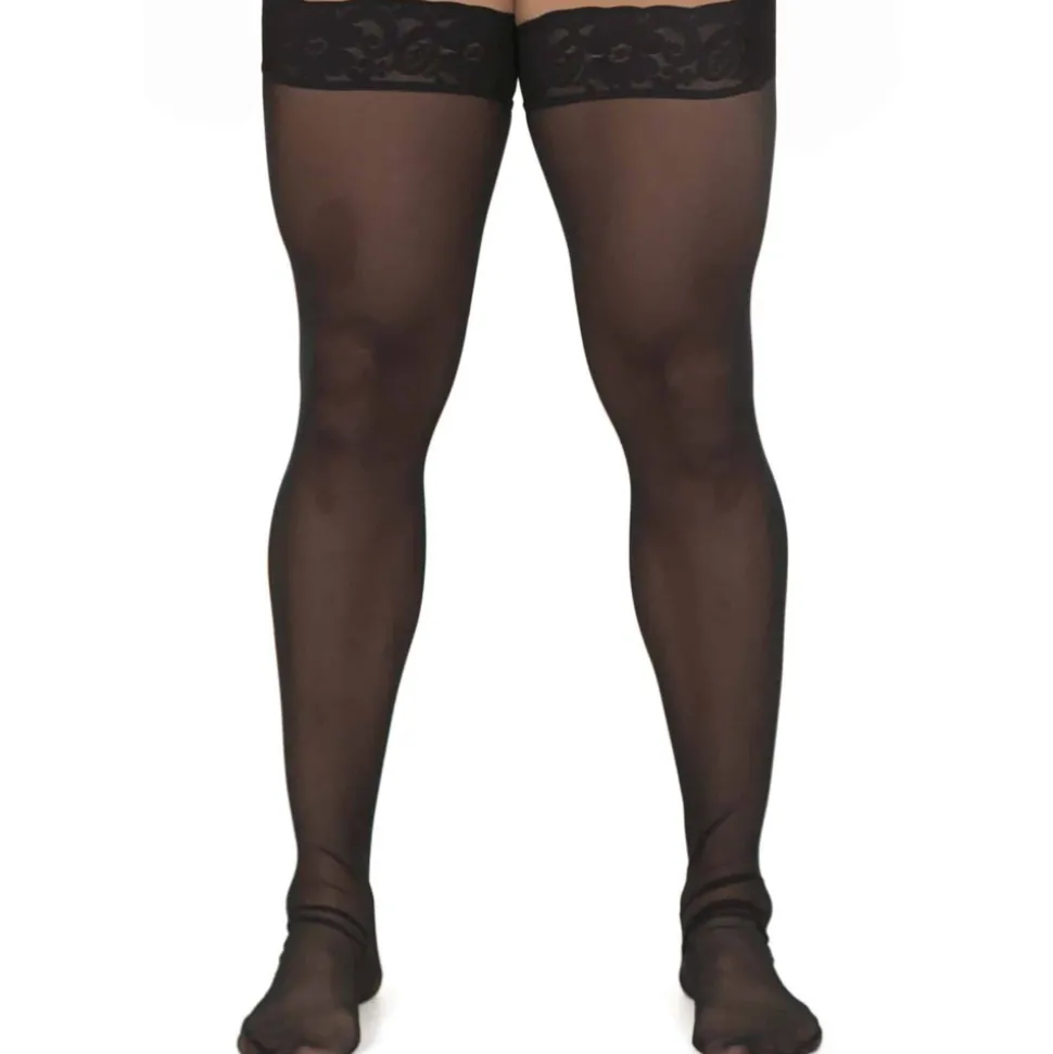 Paire de bas en résille transparente. Dentelle sur la partie supérieure. Bande antidérapante en silicone pour maintenir les collants en haut des cuisses. Taille unique.