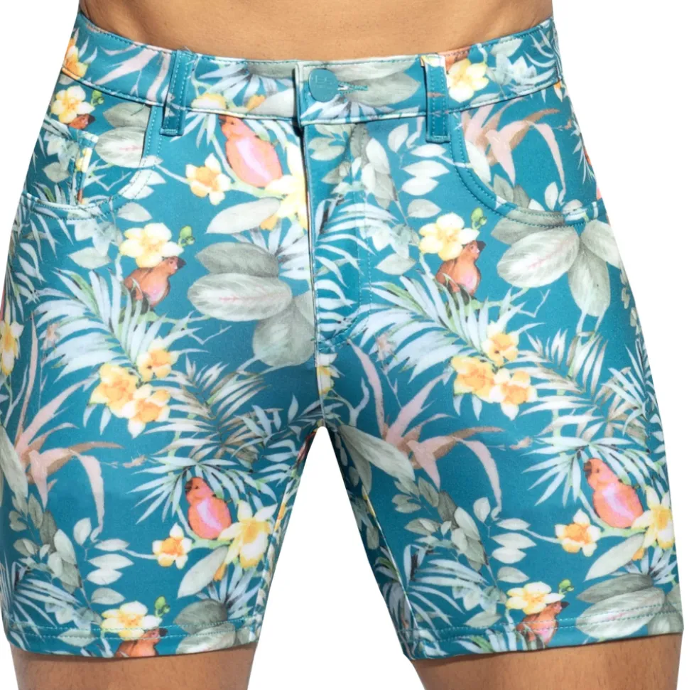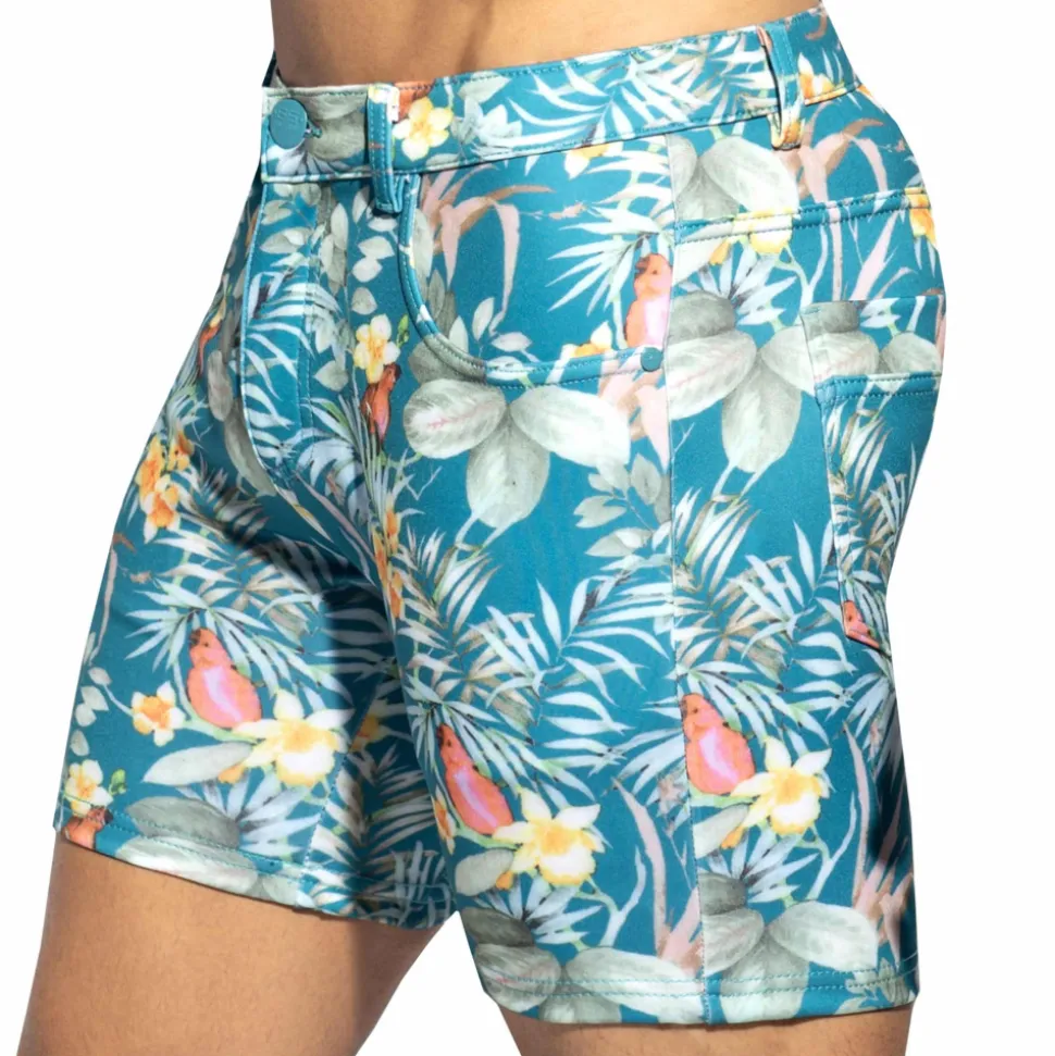 Bermuda très ajusté en microfibre stretch, douce et respirante. Imprimé tropical coloré. 5 poches. Passants de ceinture. Coutures et rivets façon jean. Braguette à bouton et fermeture Eclair. Grand logo ES Collection en silicone à l’arrière.