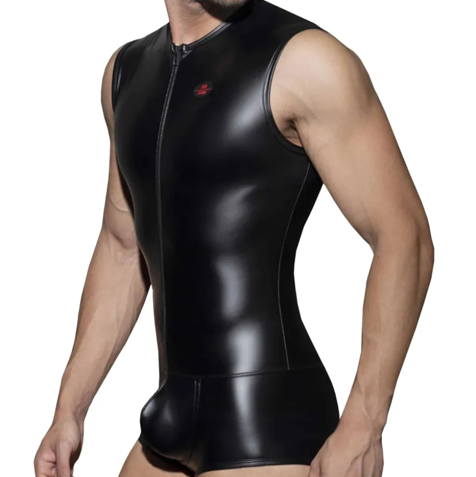 Body boxer sans manche en microfibre brillante imitant le caoutchouc, pour un look très fetish. Fermeture Eclair fonctionnelle pour un accès direct à vos parties. Technologie RingUp intégrant un anneau cock ring en silicone (diamètre 5 cm, amovible par bouton pression) pour une érection plus dure et plus longue. Anneau métallique de couleur contrastée à l’arrière. Logo AD en silicone sur la poitrine.