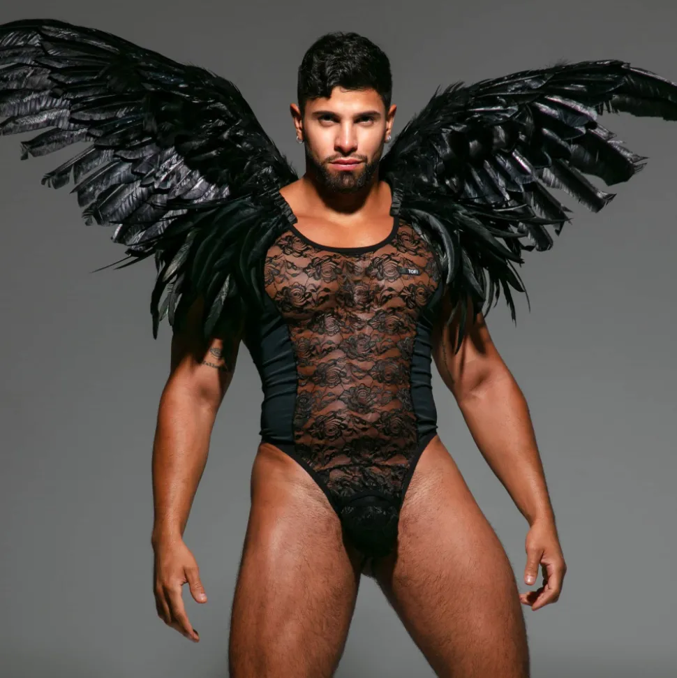Body string audacieux et sensuel en fine dentelle transparente décorée d’un subtil motif floral. Empiècements opaques sur les côtés qui structurent la silhouette. Coupe ajustée. Dos nageur. Poche frontale non doublée avec ouverture pour passer à l’action s’en rien enlever ! Etiquette TOF Paris cousue sur la poitrine. Fabrication française.