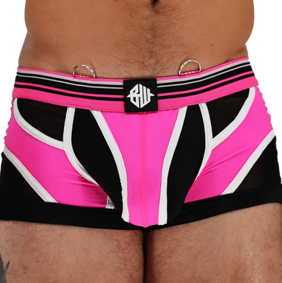 Boxer original et audacieux en microfibre ultra douce et confortable. Empiècements transparents en résille fine. Bandes de couleur contrastée pour un style graphique. Poche frontale non doublée. Ceinture élastique rayée dotée de 2 anneaux métalliques pour attacher le harnais Circuit Breaker (vendu séparément). Patch Breedwell devant et logo en silicone derrière.