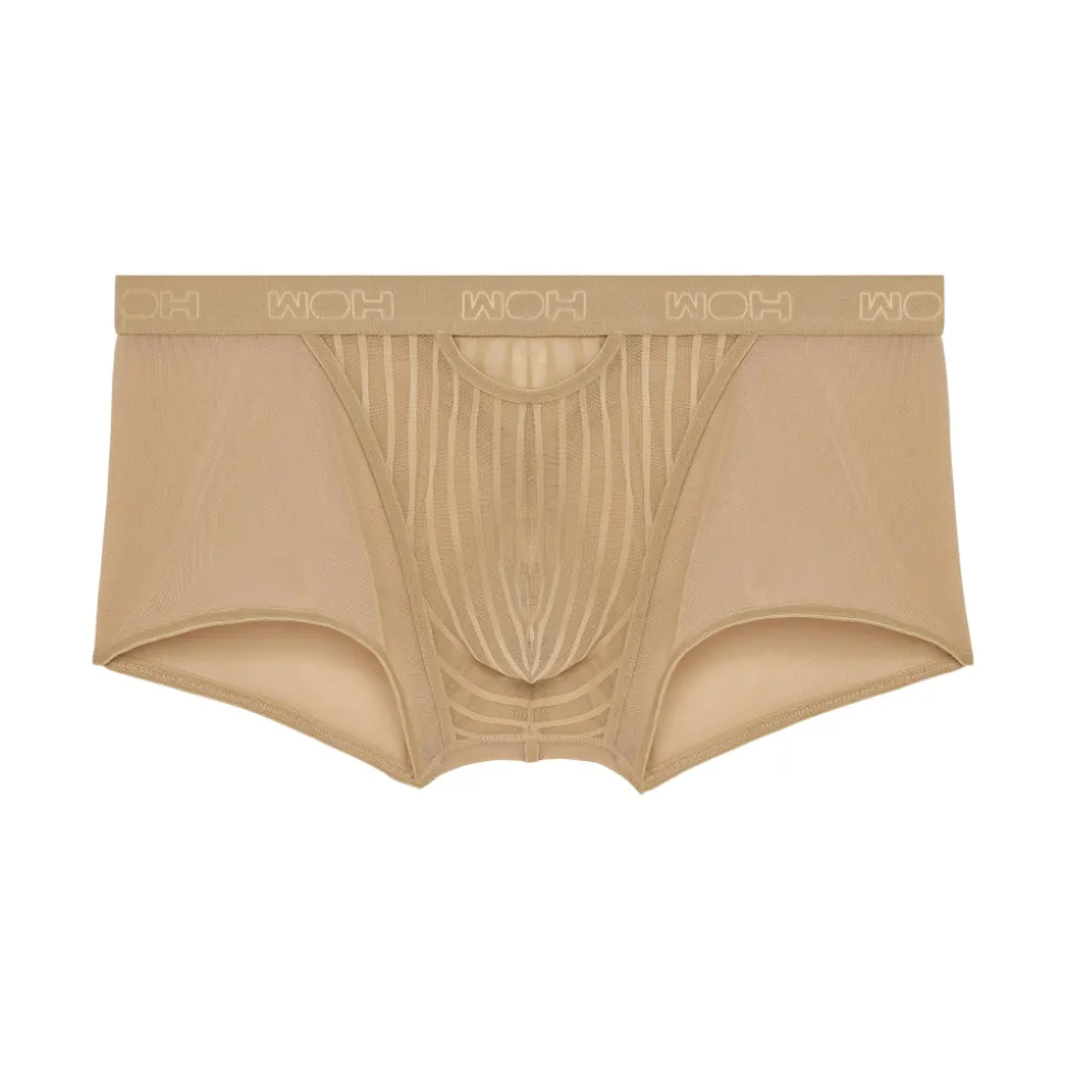 Boxer sexy et élégant en résille fine et luxueuse. Alternance de rayures verticales opaques et transparentes sur la poche frontale et le haut des fesses. Ouverture provocante au-dessus de la poche. Fine ceinture élastique signée WOH.