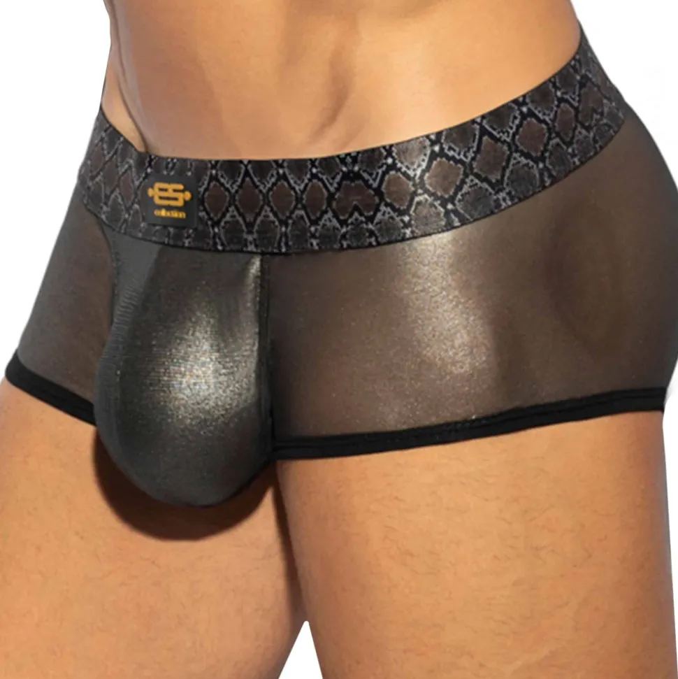 Boxer taille basse très ajusté en tulle recouvert d’un film doré. Tissu fin, extensible et transparent. Poche frontale push-up pour pour un excellent maintien et une valorisation de votre masculinité. Ceinture élastique imprimée d’un motif serpent. Logo ES Collection en silicone.