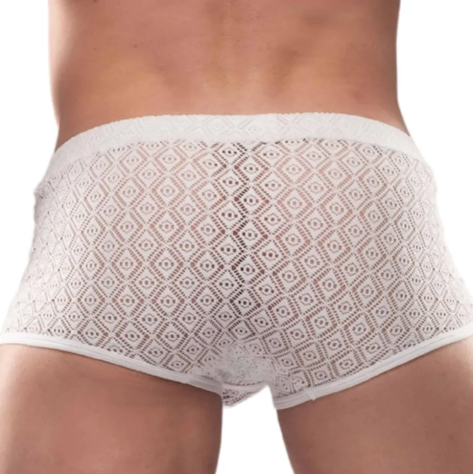 Boxer court, audacieux et élégant en dentelle semi-transparente décorée d’un motif géométrique. Coupe taille basse. Poche frontale non doublée. Ceinture élastique recouverte signée TOF Paris. Fabrication française.