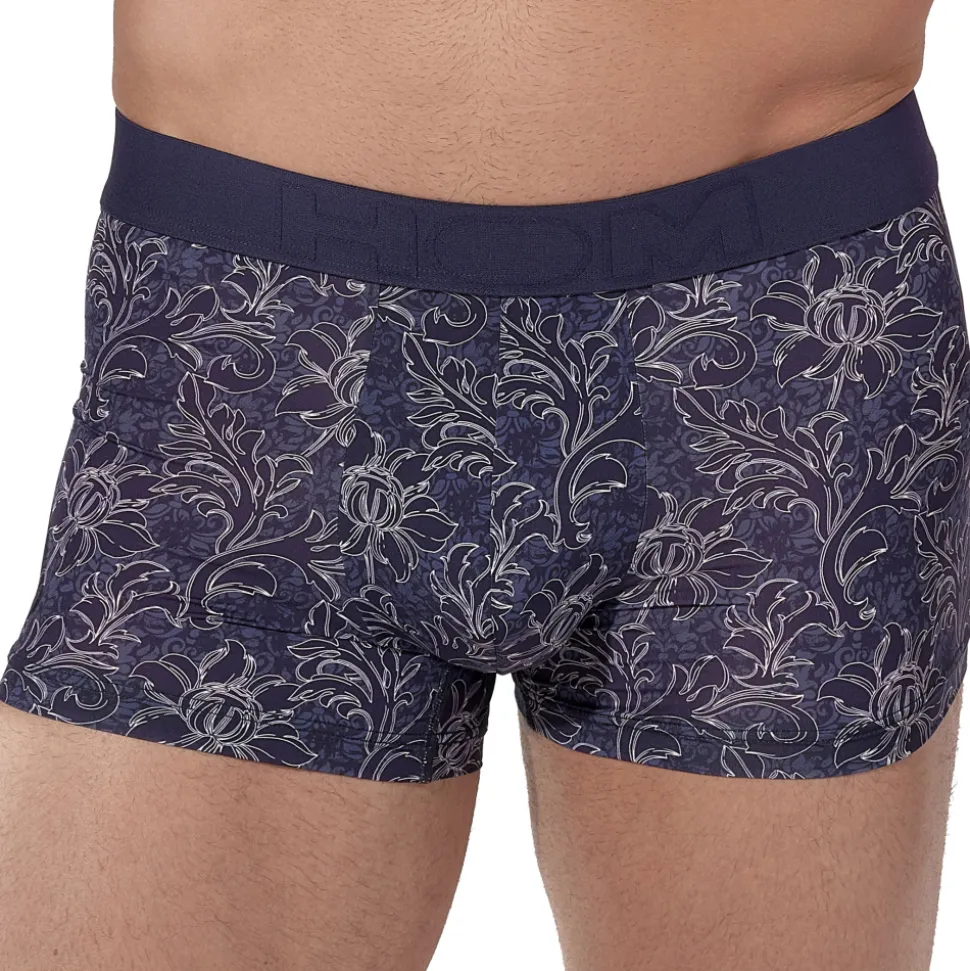Boxer sensuel et luxueux en microfibre douce et ultra légère, pour un effet seconde peau. Imprimé floral stylisé aux contours blancs et motifs baroques en camaïeux de bleu,. Poche frontale doublée. Tissu de qualité supérieure certifié Oeko-Tex. Ceinture élastique signée HOM.