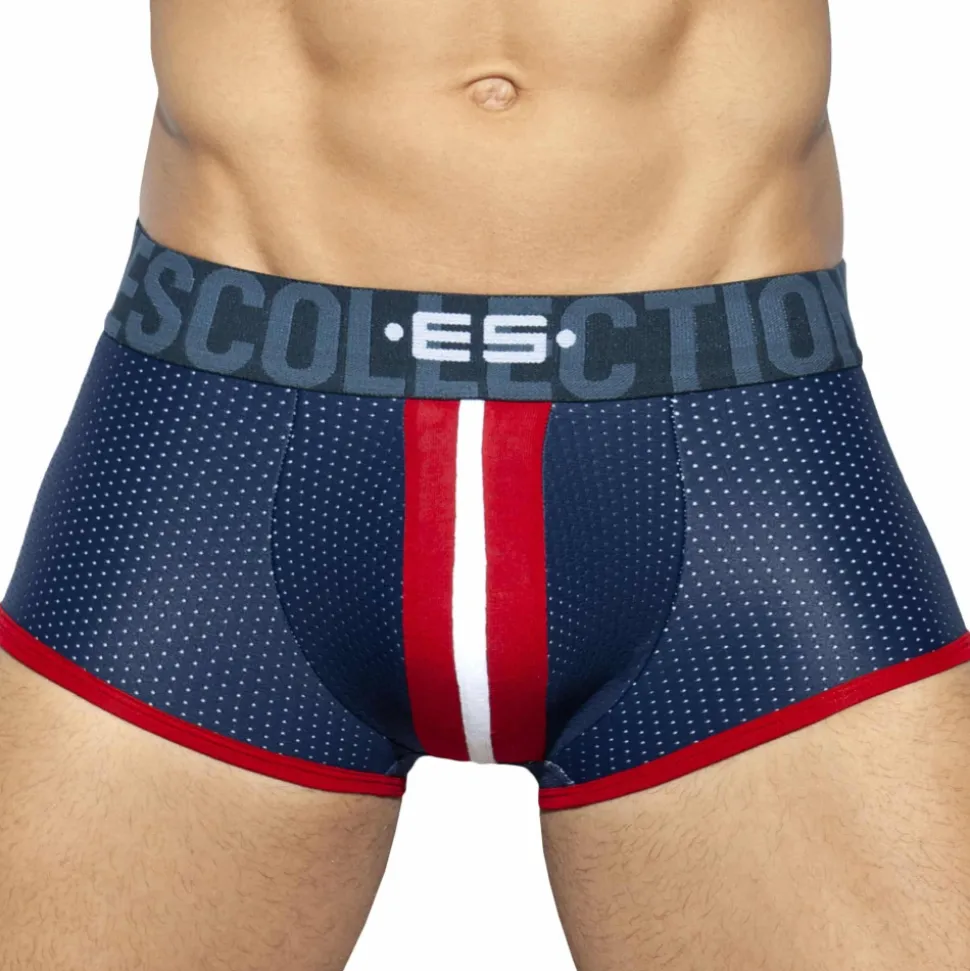 Boxer taille basse en mesh léger, doux et respirant. Entièrement doublé. Les mousses amovibles Super Bulk devant et derrière valorisent naturellement votre masculinité et votre fessier. Détails de couleur contrastée. Ceinture élastique signée ES Collection.