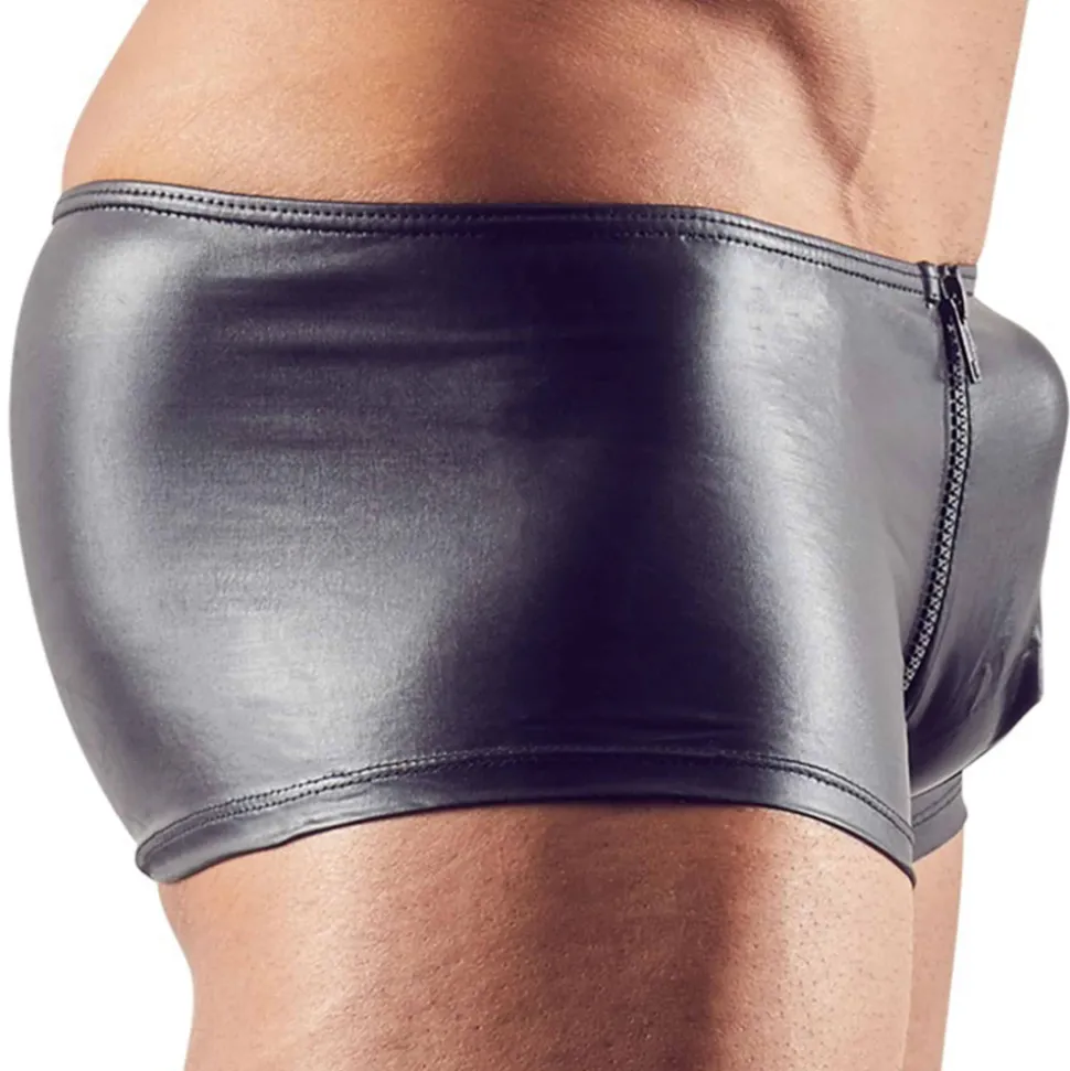 Boxer sexy et provocant en simili cuir extensible, souple et brillant. Coupe taille basse et ajustée. Les fermetures Eclair de chaque côté de la poche frontale sont une invitation au jeu. Non doublé. Coutures arrières apportant plus de volume à votre fessier. Fine ceinture élastique recouverte.
