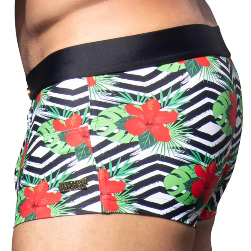 Boxer de bain ajusté en microfibre extensible très douce et confortable. Motif floral coloré sur un fond d’inspiration ethnique en noir et blanc. Poches et braguette factices. Ceinture élastique amincissante de couleur contrastée. Plaque métallique signée Andrew Christian sur la cuisse gauche. Edition limitée.