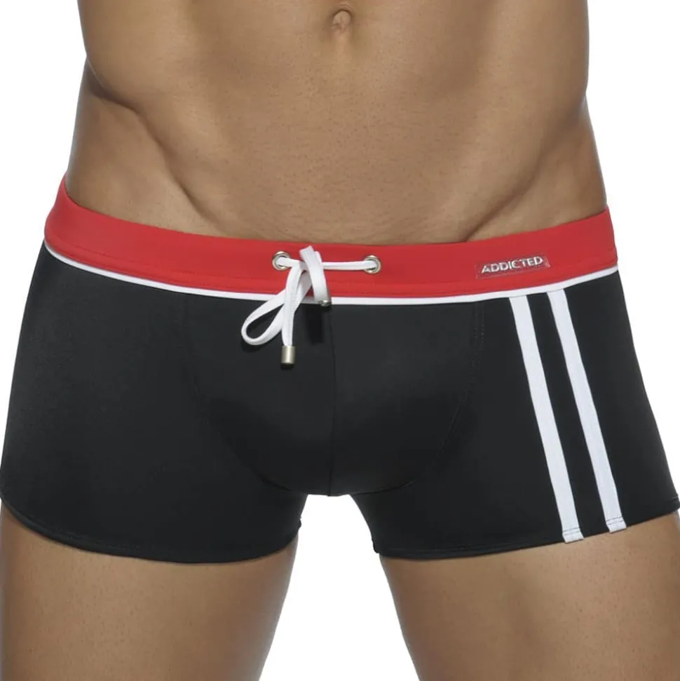 Boxer de bain taille basse, sexy et très ajusté. Système Pack Up intégré avec mousse amovible pour mettre en avant votre masculinité. Double bande sport sur la cuisse gauche. Ceinture élastique contrastée avec cordon de serrage. Logo Addicted en silicone.