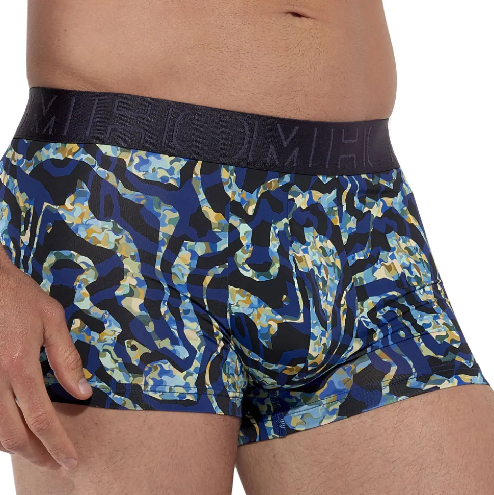 Boxer taille basse en microfibre extensible ultra douce et confortable. Imprimé abstrait aux formes irrégulières. Poche frontale doublée. Ceinture élastique signée HOM.
