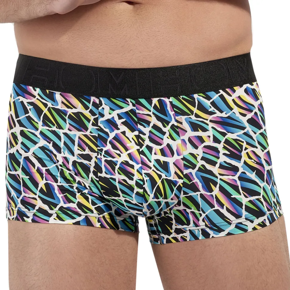 Boxer taille basse en microfibre extensible ultra douce et confortable. Imprimé abstrait multicolore. Poche frontale doublée. Ceinture élastique signée HOM.