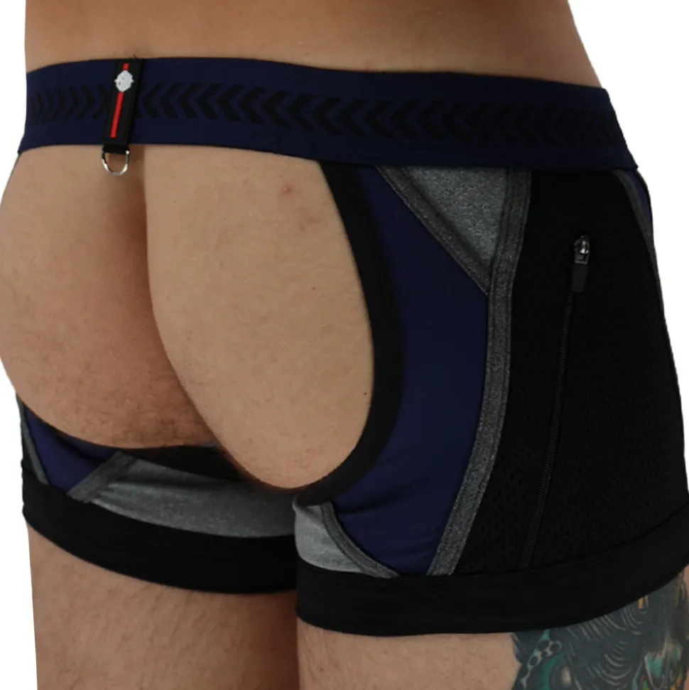 Sous-vêtement au design original et provocant combinant un jockstrap et un boxer. Conçu en jersey épais et doux de qualité supérieure. Bandes contrastées et empiècements latéraux en résille soulignent le volume de la poche frontale. Poches latérales zippées en mesh. Ceinture élastique décorée d’un motif à chevrons. Anneaux métalliques pour attacher un harnais body (vendu séparément). Patchs Breedwell en PVC.